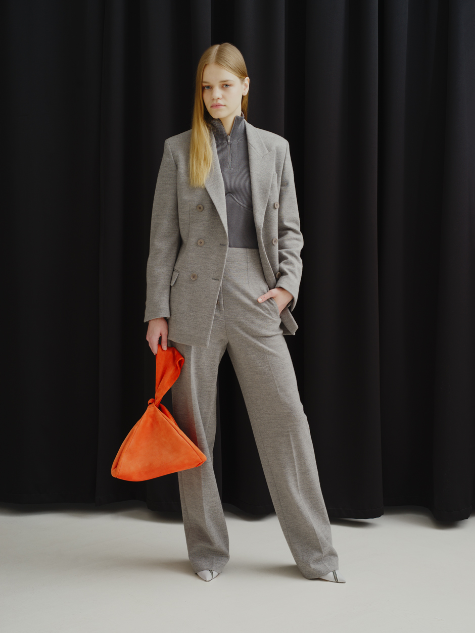 В сочетании водолазки и брючного костюма нет ничего необычного. Другое дело, когда первая выполнена в стиле горнолыжного свитера с молнией на вороте — такая есть, например, у Balenciaga. Сочетание классического и спортивного стилей остается одним из самых актуальных уже не первый сезон, а чтобы точно закрепить попадание в тренд, подберите водолазку под цвет костюма, а в качестве акцента добавьте яркую сумку.