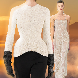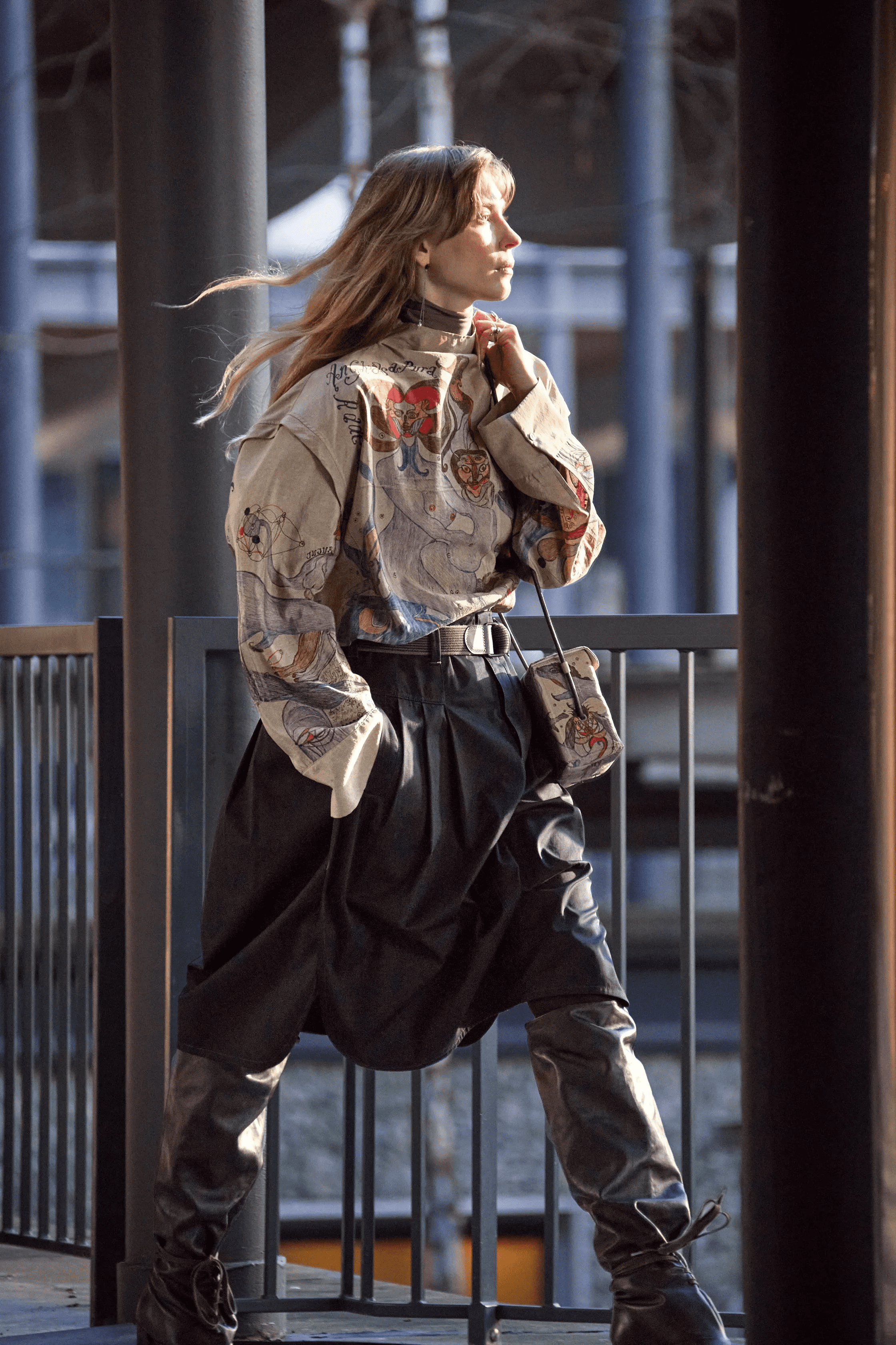 Не первый сезон Кристоф Лемер и Сара-Линн Тран открывают для своих клиентов малоизвестных представителей ар-брюта. В коллекции осень-зима 2023 не было принтов, за исключением пары образов с работами Новиади Ангкасапуры, современного художника из Индонезии. Их можно узнать по странным мистическим существам, но тревожные образы этих изображений в коллекции смягчают обволакивающие силуэты платьев и рубашек.
