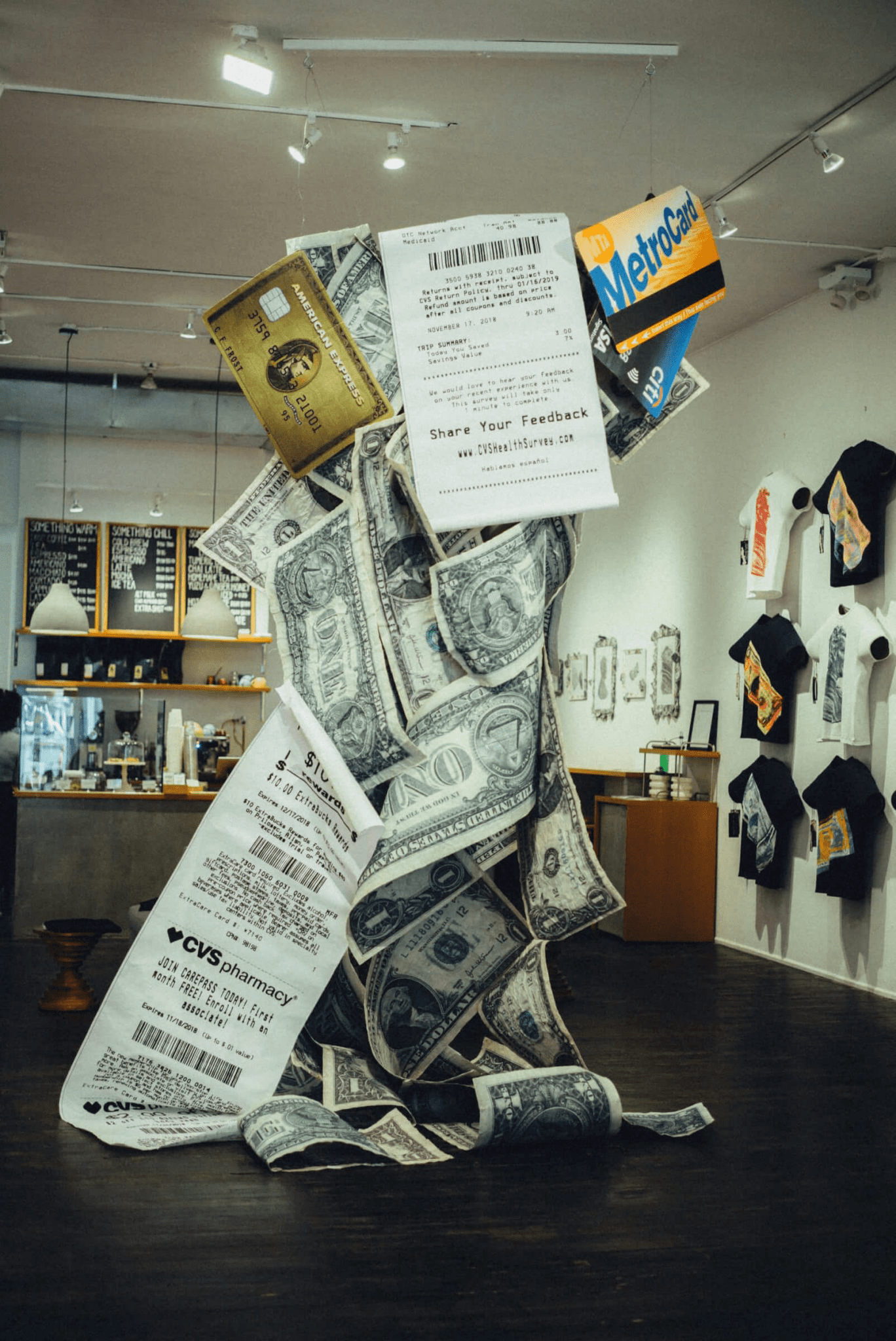 Традиционная японская философия подразумевает, что японец бережно относится к своим деньгам. Художник и дизайнер Кото Окуда, когда-то приехавший учиться в лондонский Central Saint Martins, был потрясен, как британцы легко разбрасываются деньгами. Годы спустя эту тему он поднимает в своих коллекциях и арт-работах: платья-купюры, топы-бумажники, инсталляции с пачкой денег. Для коллекции дизайнера Михары Ясухиро он сделал ироничные денежные платья, рубашки и накидки — мы называем их «костюмом дня зарплаты».