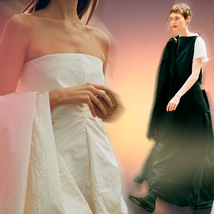 Креативный директор Loewe Джонатан Андерсон — большой коллекционер совриска. В новом сезоне дизайнер открыл нам американского художника Жюльена Нгуена, чьи произведения сочетают в себе академическое искусство, реализм и сай-фай. Два полотна Нгуена стали частью сет-дизайна шоу, а несколько образов коллекции повторяют одежду с картин. Например, пальто-платья с декольте, которое заканчивается ниже пупка. Сходство моделей с персонажами картин усиливают цветные линзы.