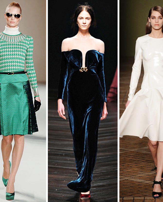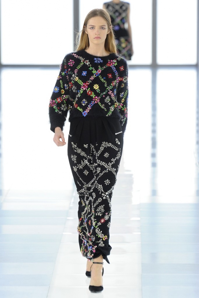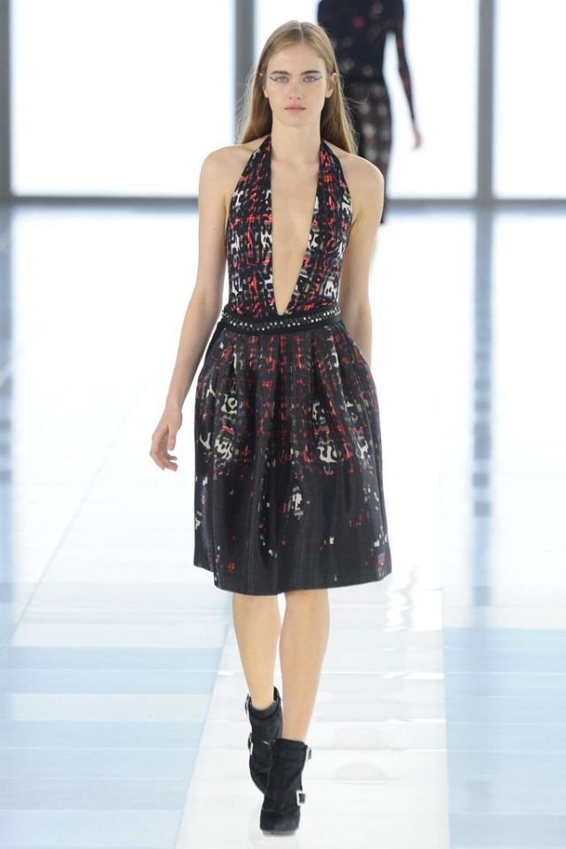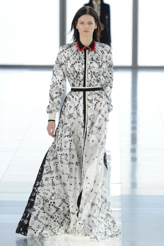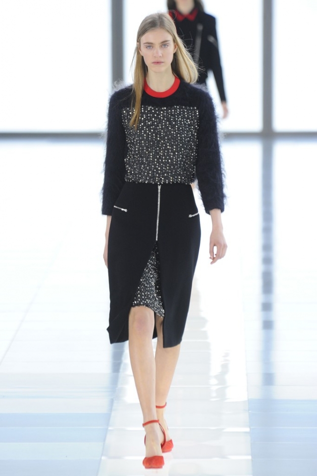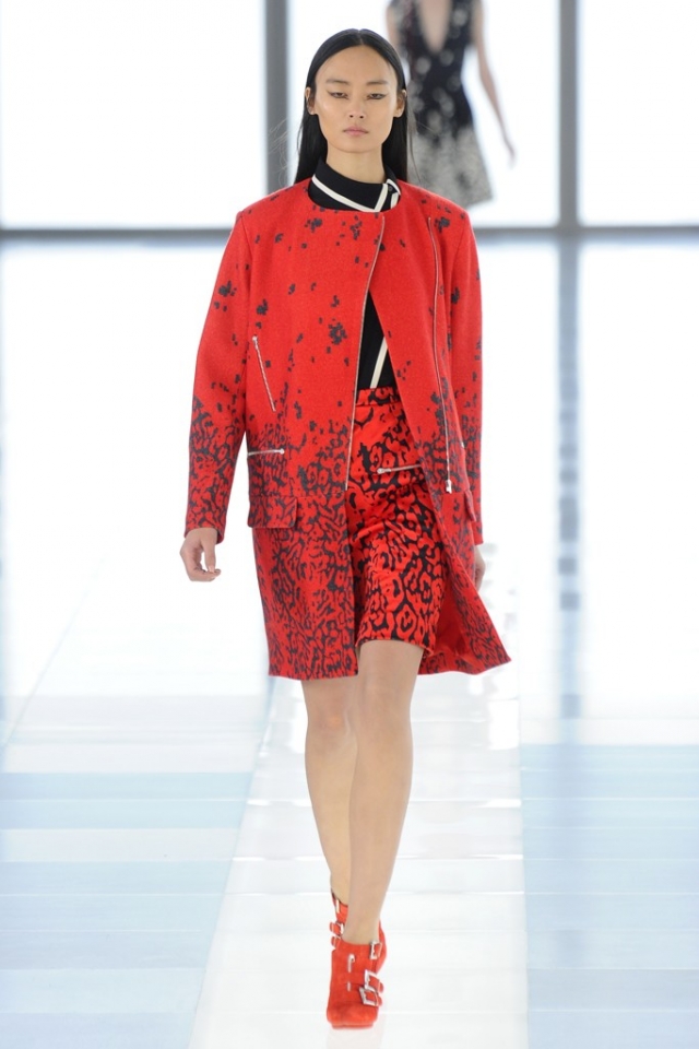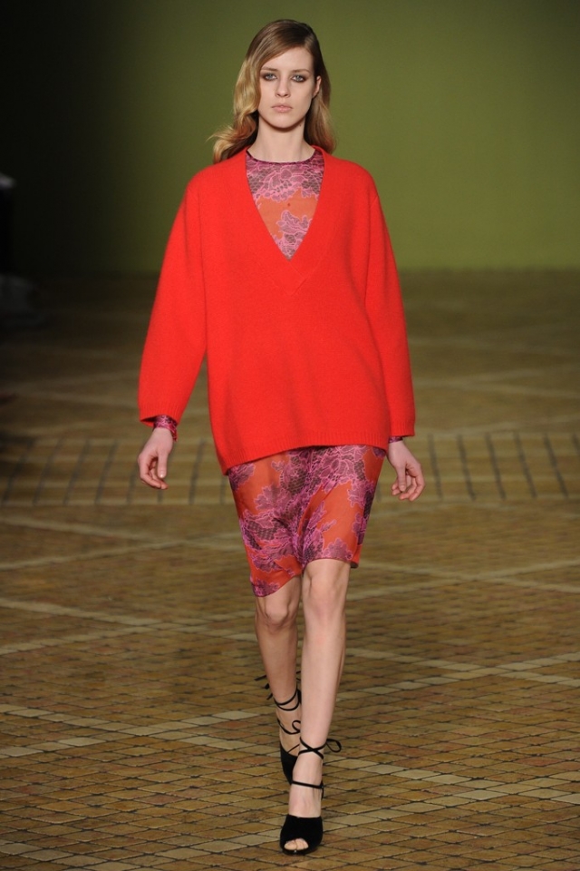 Присоединяясь к игре в ретро, которую затеяли "нью-йоркские" дизайнеры Каролина Эррера, Марк Джейкобс и Донна Каран, Джонатан Сондерс предпочел 40-е и 50-е. В его новой коллекции нашлось место как платьям с тонкими бретелями и клешеной юбкой до колена, так и остроплечим двубортным жакетам, затянутым на талии широким кожаным ремнем и дополненным широкой кожаной юбкой. За современность отвечали материалы вроде глянцевитой кожи и размашистые аппликации на подолах платьев. "Локоны а-ля Лана Дель Рей и будуарные лодочки Christian Louboutin дополняли образы, доводящие до радикальности идею женственности — топы-бюстье (иногда со специально виднеющимися бюстгальтерами), юбки-карандаш или юбки-пудель и свитеры с чрезмерными V-образными вырезами", — пишет журналист Vogue US Хемиш Боулз.