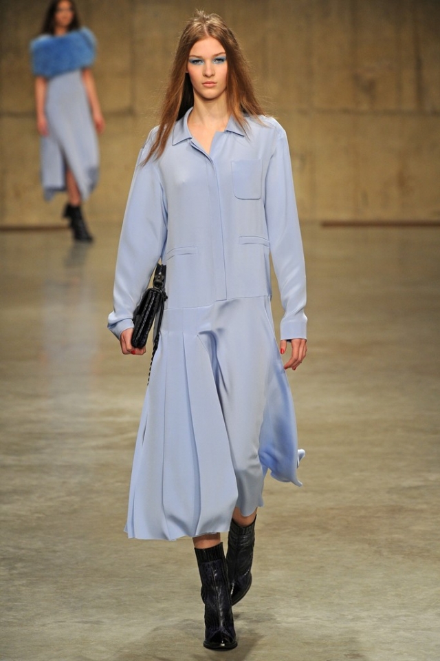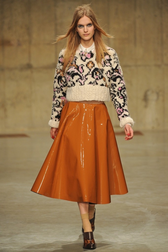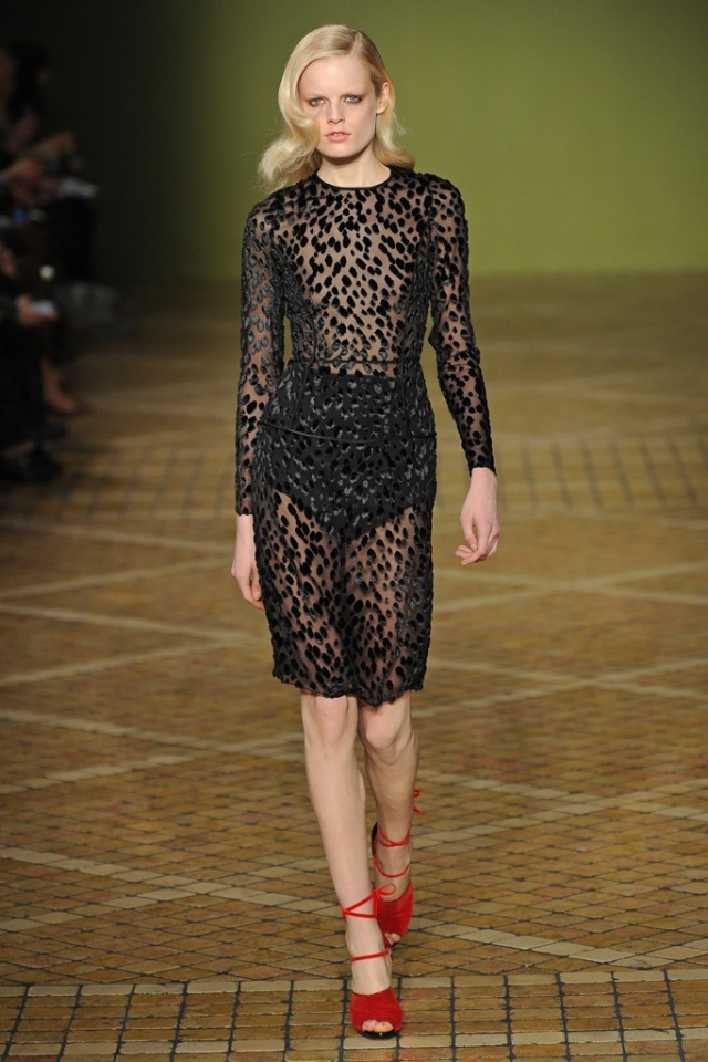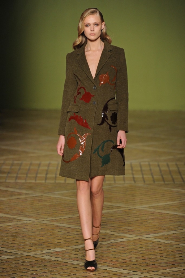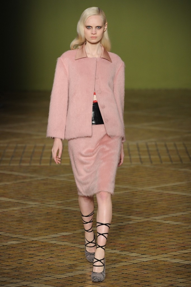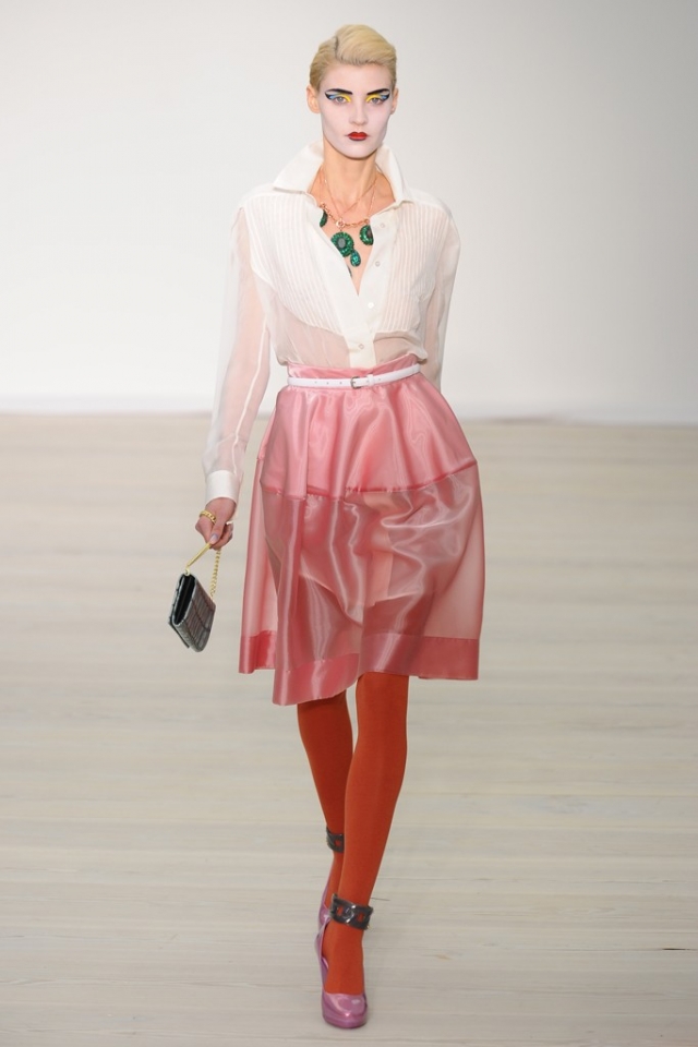 В коллекции осень-зима 2013/14 дизайнер марки Temperley London Элис Темперли вспомнила образ Типпи Хедрен в "Птицах" Альфреда Хичкока. "В отличие от фильма, в коллекции очень не хватало драматизма", — написали в WWD. Протестуем! Чем не драматичны темные очки в сочетании с пальто и короткими перчатками, холодно накинутые на плечи жакеты или даже короткие пальто в сочетании с лодочками? Драматична даже цветовая палитра — невинно-светлая, не предвещающая ничего дурного. Особенно удался выход №17 — фисташковый джемпер с рисунком и белым воротом, затянутый на талии тонким пояском, чуть клешеная юбка в тон длиной до колена, лодочки и кожаные перчатки.