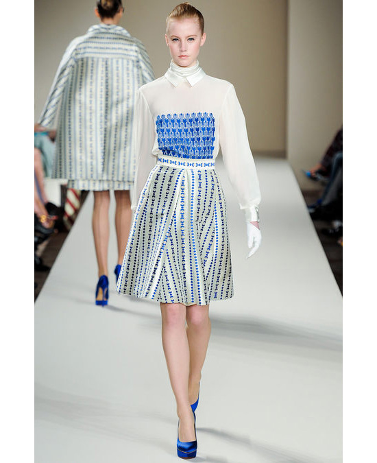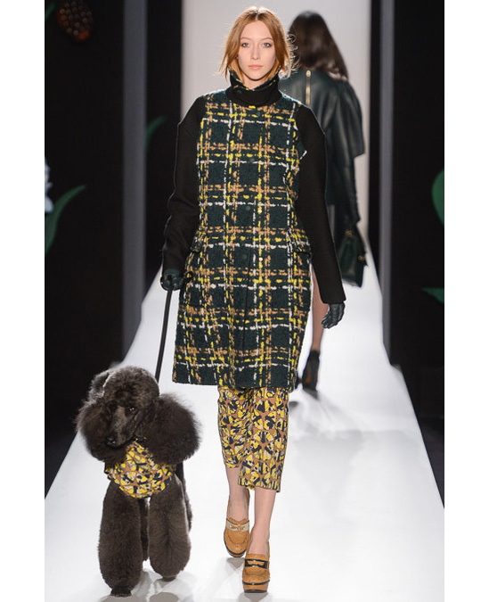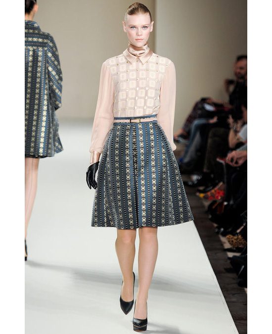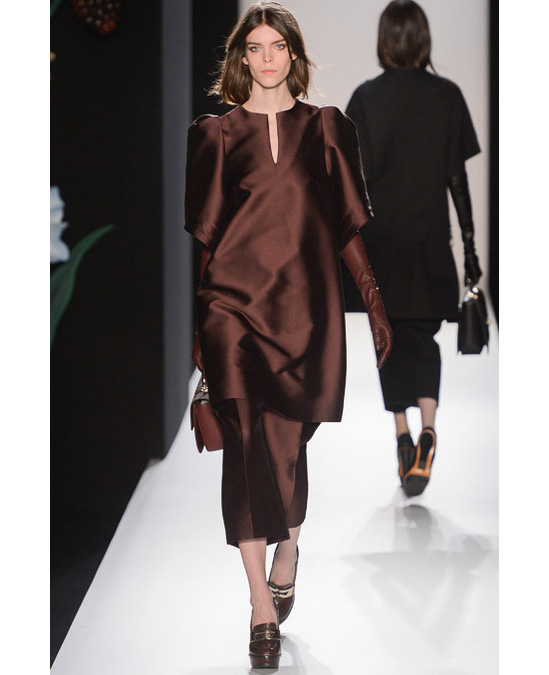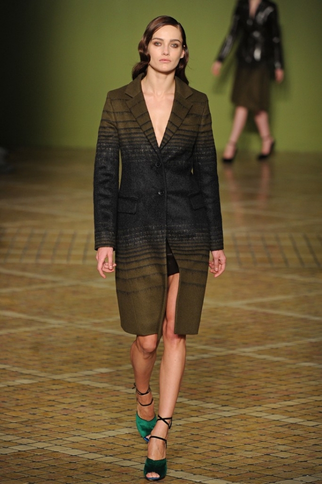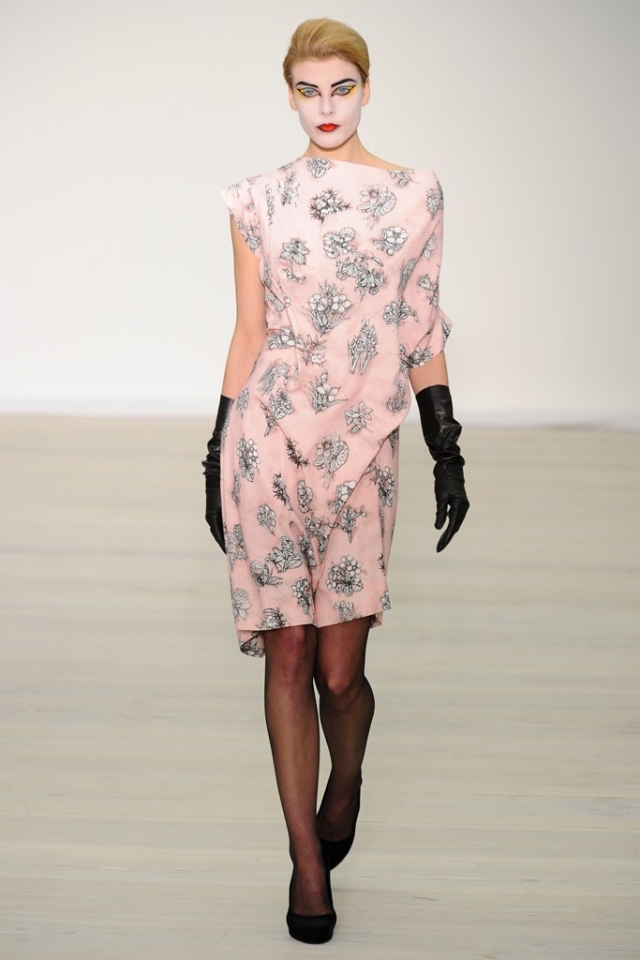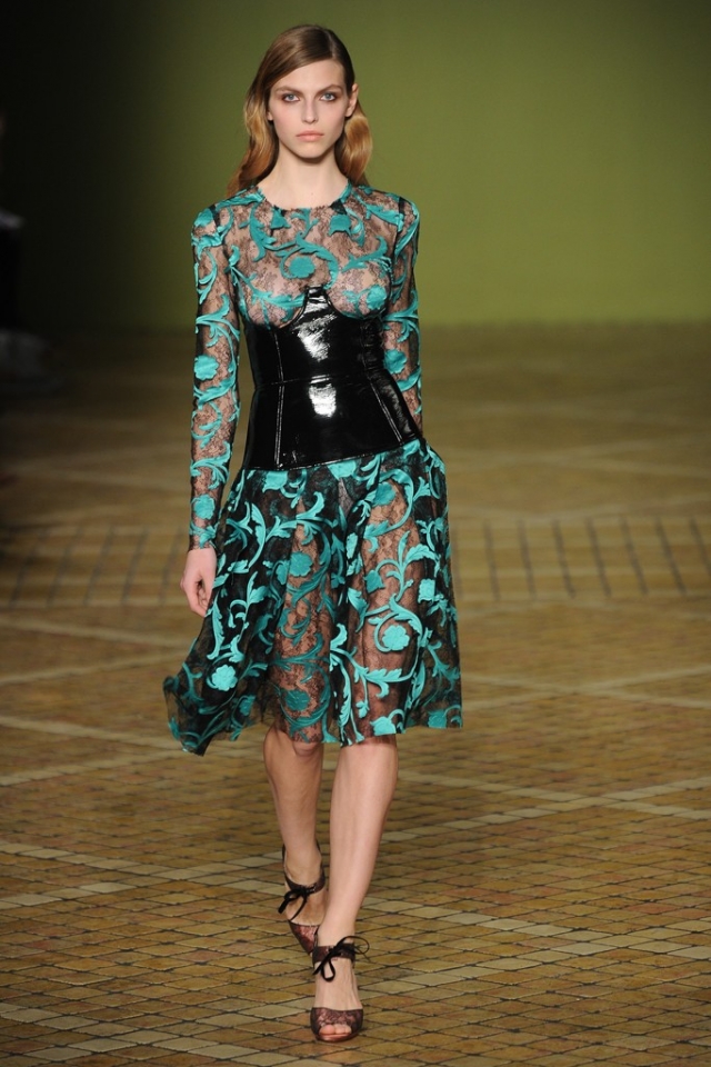 В коллекции осень-зима 2013/14 дизайнер марки Temperley London Элис Темперли вспомнила образ Типпи Хедрен в "Птицах" Альфреда Хичкока. "В отличие от фильма, в коллекции очень не хватало драматизма", — написали в WWD. Протестуем! Чем не драматичны темные очки в сочетании с пальто и короткими перчатками, холодно накинутые на плечи жакеты или даже короткие пальто в сочетании с лодочками? Драматична даже цветовая палитра — невинно-светлая, не предвещающая ничего дурного. Особенно удался выход №17 — фисташковый джемпер с рисунком и белым воротом, затянутый на талии тонким пояском, чуть клешеная юбка в тон длиной до колена, лодочки и кожаные перчатки.