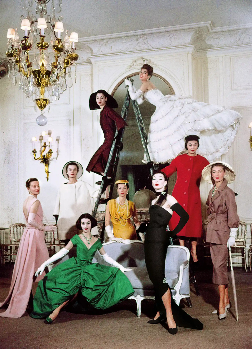 Снимок из журнала Life. Модели позируют в образах из свежей коллекции Christian Dior в салоне на авеню Монтань в Париже.