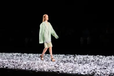 На этих же лаконичных костюмах в черном Дрис оставлял фирменные послания — украшал один из рукавов золотой вышивкой или вешал крупные броши на лацкан. Белоснежные оверсайз жакеты, как бы небрежно застегнутые на одну пуговицу, миксовал с бермудами и питоновыми босоножками на каблуке, вручая в руки моделям вместительные тоуты; плащи подпоясывал грубым кожаным ремнем, а куртки расшивал «каплями» золота. К дождевикам, напоминающим конфетную обертку в красивом фиолетово-черном, подбирал баклажановые карго, а затем шаг за шагом вводил в эту палитру перламутрово-розовый, мятный, охру и бледно-салатовый. Он прятал классические жакеты и цветы, распустившиеся на рубашках и брюках, под рубашками и плащами, но уже из полиэтилена. А в финале разбавил несколько total looks в черном будто отлитыми из золота и серебра шортами, брюками, футболками и пиджаками, которые, казалось, вот-вот — и растекутся по подиуму.