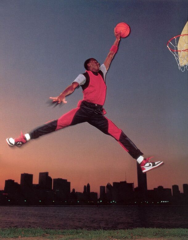 Майкл Джордан c кроссовками Air Jordan 1, 1984 год