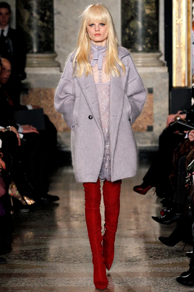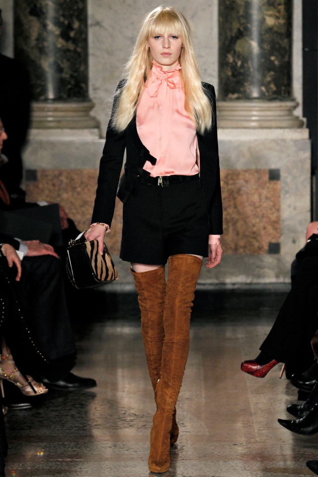 Раз уж так повелось, что каждому дизайнеру в этом сезоне полагается своя муза из одного из модных десятилетий, для дизайнера Питера Дандаса ими стали рок-богини 70-х — Анита Палленберг, Бритт Экланд и Энджи Боуи. Это из их гардеробов перекочевали на подиум мини-юбки и мини-шорты, сапоги-чулки, двубортные пальто и монохромные свободные туники (как написала редактор Style.com Николь Фелпс, "цвет — еще одна вещь, куда-то пропавшая в этом сезоне"). Примечательно, что со всей преданностью 70-м коллекции Питеру Дандасу удалось сохранить оригинальный стиль Pucci с его знаковым разноцветным абстрактным принтом на юбках и платьях. "В своих последних коллекциях Питер Дандас несколько отошел от наследия Pucci, избегая принтов и даже демонстративно от них отказываясь, — пишет Николь Фелпс. — Не в этом сезоне. Специально или нет, в этом шоу он словно завершил полный цикл". И — добавим — покорил продуманностью и завершенностью коллекции: модели даже выходили в париках с длинными распущенными волосами и челками, как у другой героини 70-х — Джейн Биркин.