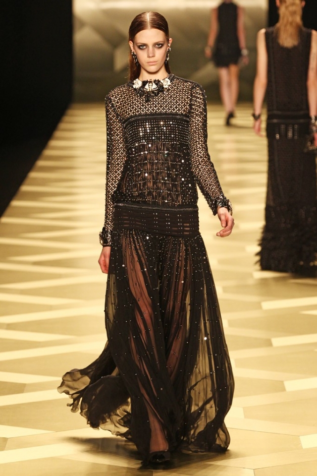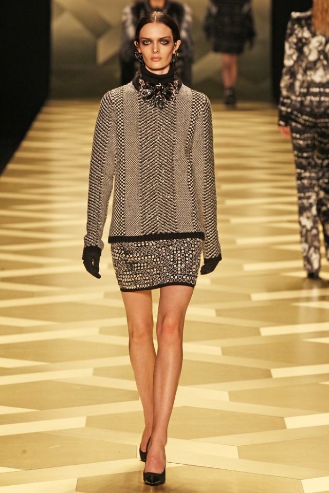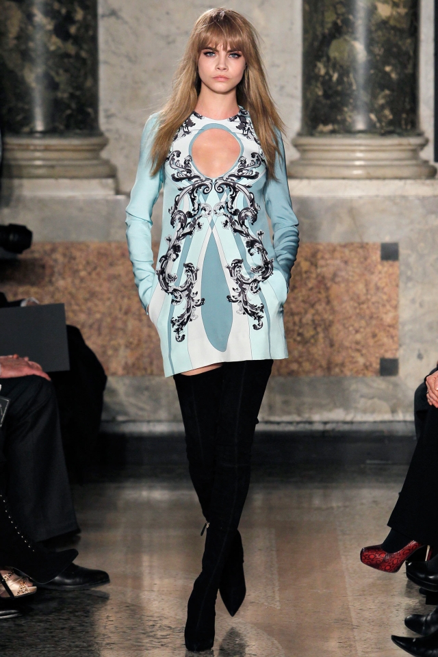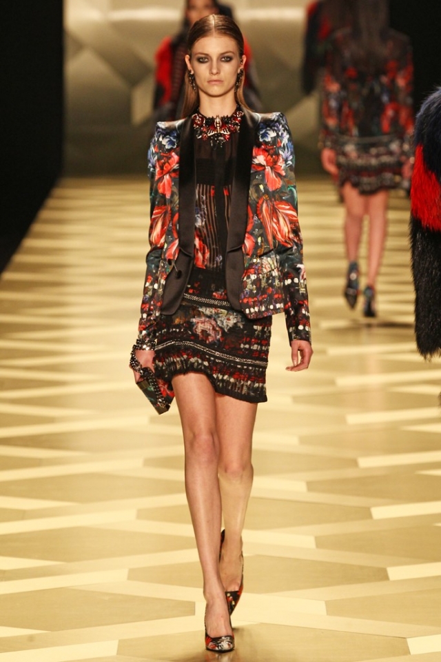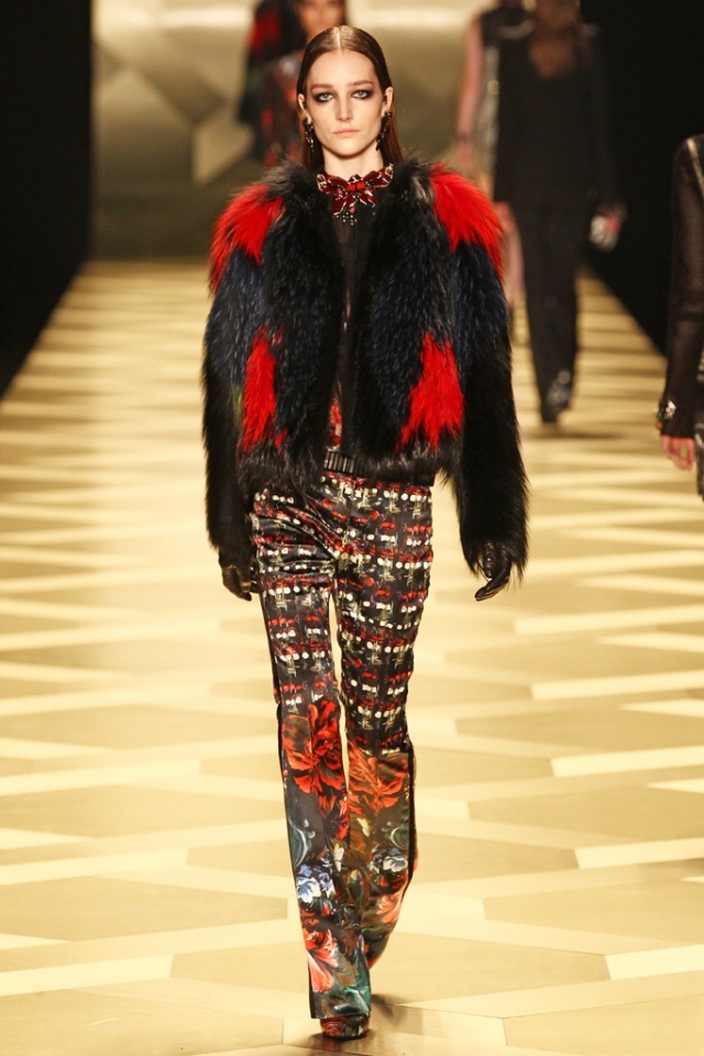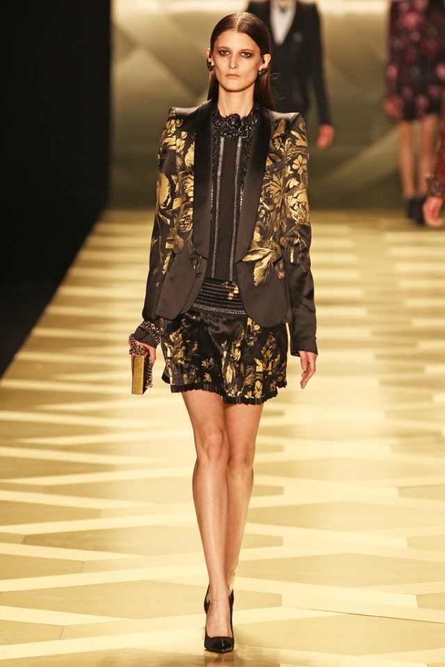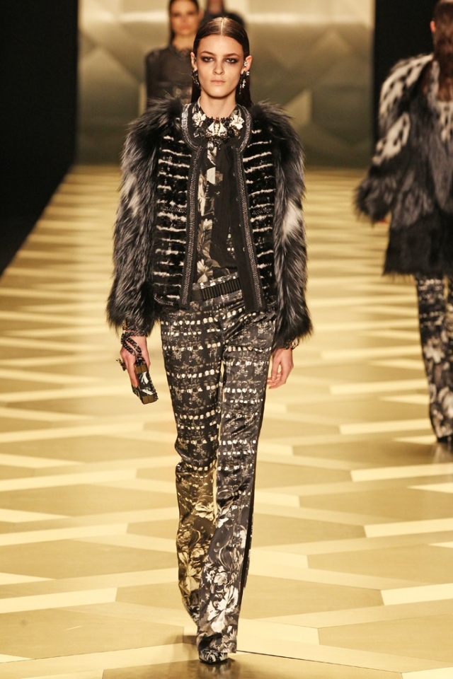 Роберто Кавалли, как немногие другие, не разделил любовь дизайнеров к модным десятилетиям XX века, которые, кстати, уже порядком надоели. Вместо этого он обратился к работам Рубенса и Караваджо, чтобы на их основе создать принты — с цветами, в стиле барокко. То, что из этого вышло, отлично смогли рассмотреть сидевшие в первом ряду: на лацканах пиджаков, подолах юбок и штанинах чуть расклешенных брюк. Вторая часть коллекции Roberto Cavalli показала развитие темы современной женщины-воина, которая у Кавалли предстала в блестящем платье-кольчуге, декорированном клепками и цепями и дополненном самой женственной обувью, которую только можно себе представить — лодочками с острым носком. На Vogue.com коллекцию похвалили, заявив, что хоть она и была выдержана в мрачной цветовой гамме, все равно получилась элегантной и романтичной.