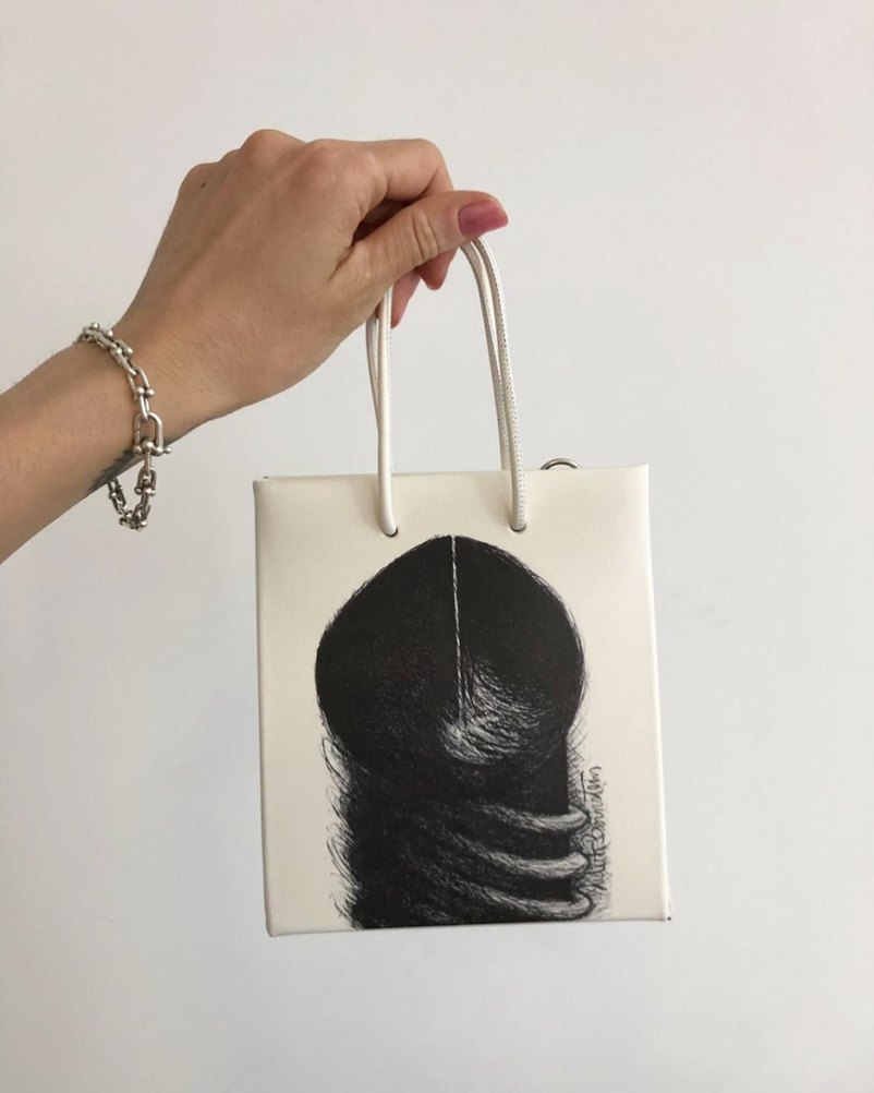 Ольга [Карпуть] была первым человеком из индустрии, кто поддерживал нас с самого начала. Даже так: мы еще на запустили марку, но уже заручились ее поддержкой. Мы сделали две модели из белого винила, вдохновленные пластиковыми пакетами, которые получали покупатели магазина. С одной стороны, в этих аксессуарах мы хотели запечатлеть мгновение — день рождения «КМ20». С другой стороны, представьте, как круто будет обнаружить в своей коллекции такую сумку лет через 10: имя инстаграм-аккаунта на сумке будет приятным напоминанием о прошлом. Что будет с инстаграмом лет через десять? Наверное, он будет восприниматься так же, как мы сегодня относимся к каким-то явлениям из 1990-х. Мы специально сделали сумки черно-белыми — хотим, чтобы аксессуары были неподвластны времени.