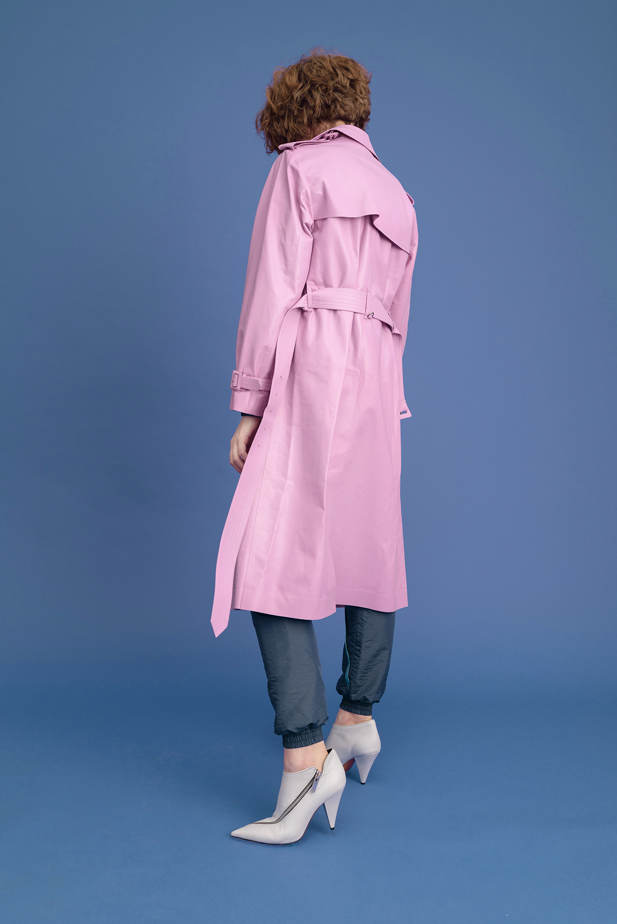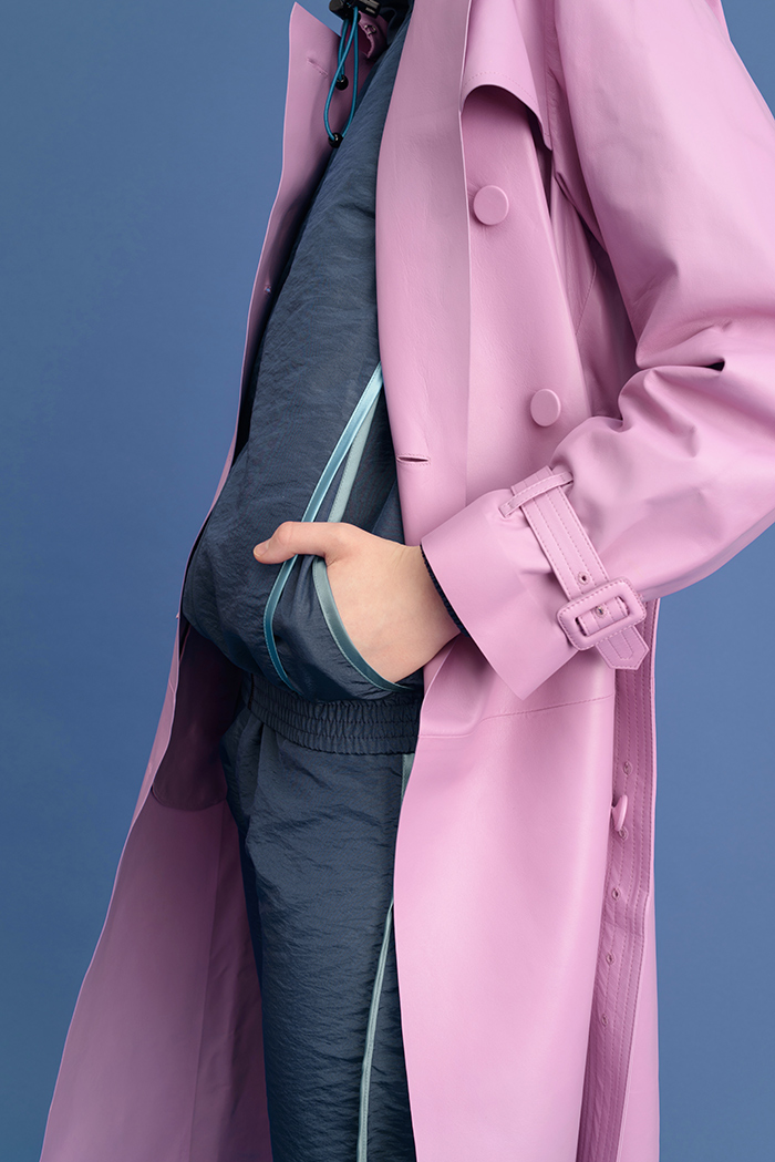 В этом сезоне кожаный плащ не обязан быть черным или коричневым — например, можно выбрать вариант розового паcтельного цвета. Для того чтобы уравновесить сорбетный оттенок, можно сочетать плащ со спортивным костюмом и яркой сумкой.