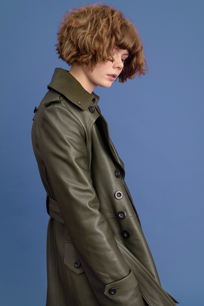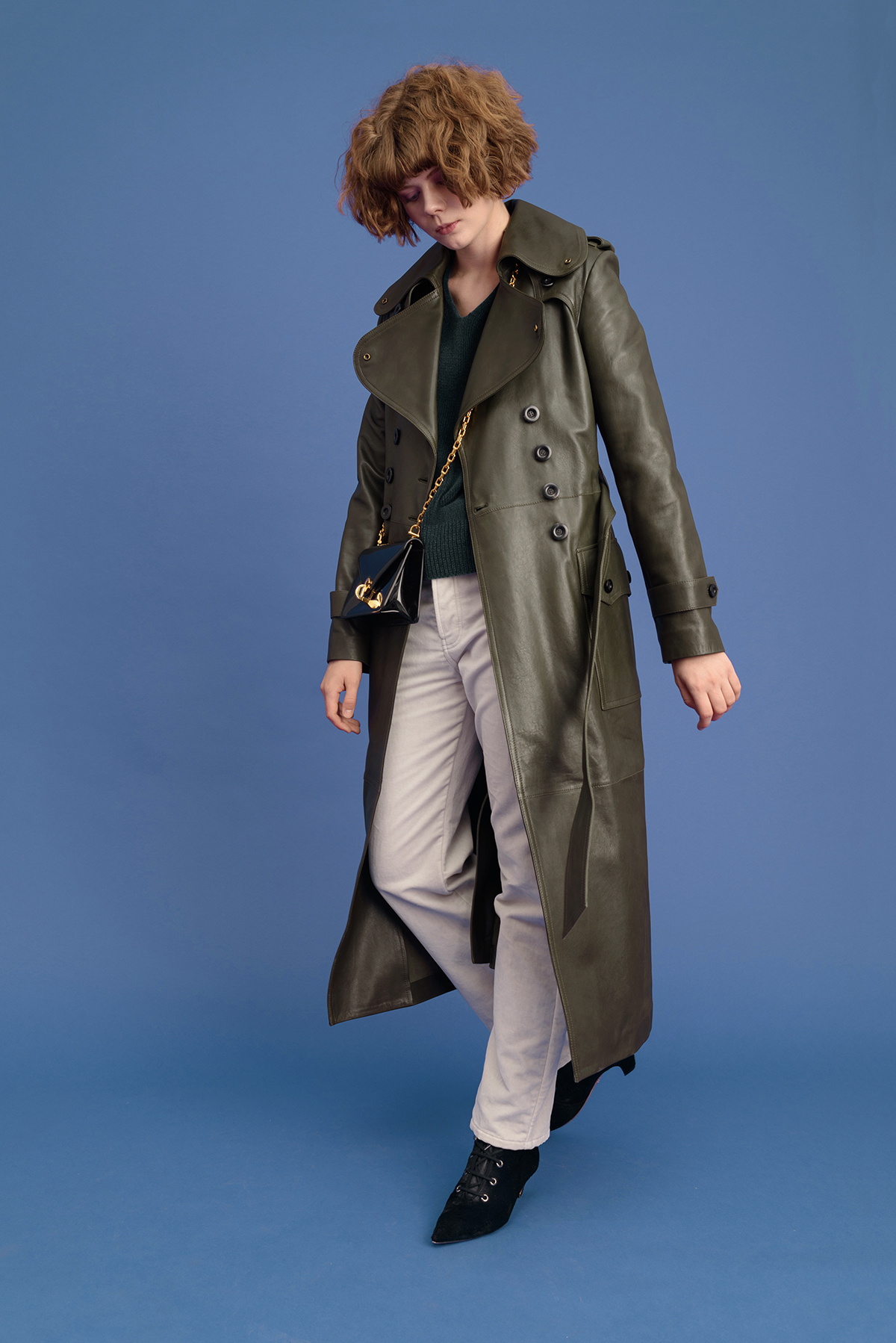 Для повседневного образа подойдет двубортный кожаный плащ болотного оттенка. Лучше всего сочетать его с изумрудным джемпером и белыми вельветовыми брюками в духе 70-х.