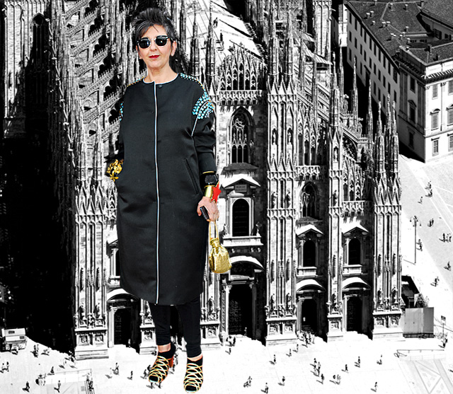 В финале этого вечера, поднимаясь по лестнице, мы с коллегой восторженно обсуждаем впереди идущую синьору. На ней надеты шелковые брюки, сплошь расшитые золотыми стразами, туфли Roger Vivier такого же цвета жидкого золота и навороченная черная кожаная косуха. При этом сама она отнюдь не худа и не молода, что решительно никак не маскирует.