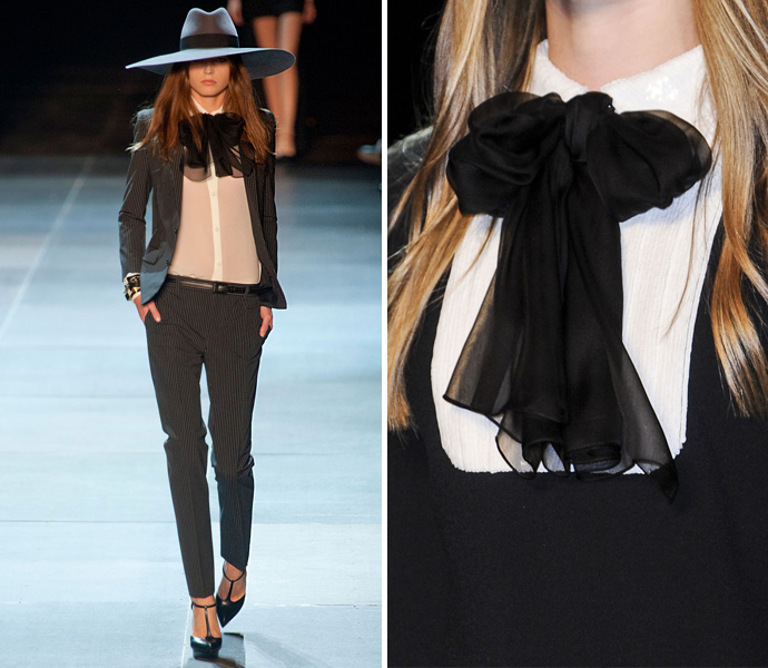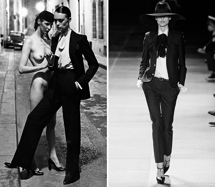 Затем в октябре Слиман показал свою первую коллекцию, составив ее из цитат самых знаменитых образов Ива Сен Лорана, и в очередной раз продемонстрировав свое умение шить узкий костюм. Но и тут у Слимана было обоснование: он говорил, что основополагающий силуэт Yves Saint Laurent для него - это фотография Хельмута Ньютона «Rue Aubriot» 1975-го года. Именно это сочетание - мужской брючный костюм плюс шелковая блуза с бантом - и стало заглавным в первой коллекции Слимана.