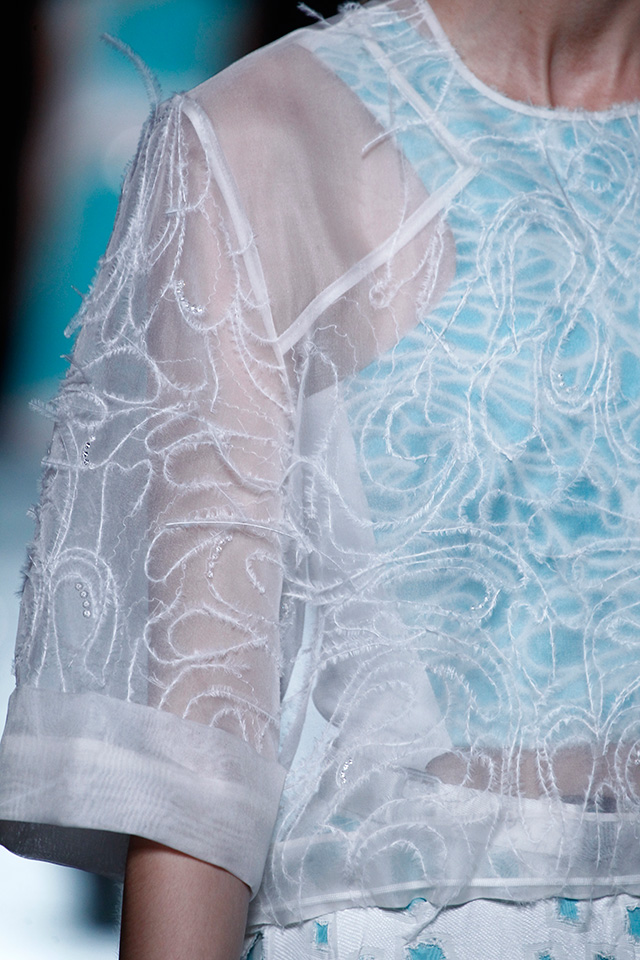 На мудборде у Гурунга женщины с блюдами на головах в традиционных непальских одеждах и макросъемки чего-то губчатого, затянутые ремнями женские и мужские фигуры и покрытые розовой дымкой величественные горы. В коллекции весна-лето 2015 дизайнер уводит нас все глубже в Гималаи — туда, где снежные шапки мерцают на вершинах утыкающихся в кристальное небо гор, а дикие розы и рододендроны усыпают холмистые луга. Такая поэтика нашла отражение как в тонком пересечении традиционных непальских силуэтов и не менее традиционной американской спортивной андрогинности, так и в характерных для Гурунга фантазийных материалах, каждую нитку в хитросплетении которых хочется рассматривать до бесконечности. Стеганый жаккард виртуозно имитирует горную породу, декадентские цветочные 3D-принты расплываются по ленивым рюшам-лепесткам, деграде (как по цвету, так и по фактуре) на дениме напоминает мох, а вышивка страусиными перьями мимикрирует под топографические карты с кристаллами-маяками, вспыхивающими при движении. Цвета отражают времена суток, отпечатанные на непальском небе: от белого к бирюзовому, лиловому, аметистовому и темно-синему, со всполохами томного закатного коралла. Идеальное, согласно единодушному решению Twitter- и Instagram-общественности, свадебное платье тут тоже было — многослойный белый шифон с выглядывающим из-под асимметричного кроп-топа бандо, усыпанным сиреневыми кристаллами Swarovski.