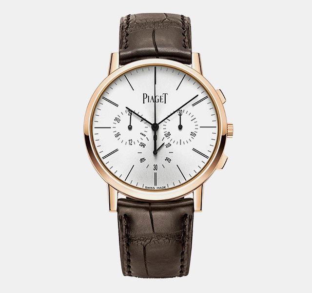 Ультратонкие механизмы уже как минимум второй год важный тренд. Как это бывает, всем разом надоело носить огромные, массивные, тяжелые (то есть мужественные) и захотелось тонких, легких и аккуратных. Piaget — главный мастер по тонким механизмам: марка делает их уже которое десятилетие для всех на свете, а Altiplano — это классическая ультратонкая коллекция бренда, существующая тоже уже примерно полвека. Так что нынешняя женевская премьера — это супермодная классика, лучшее, что только вообще может быть. К тому же тут стоит механизм 883P и это самые тонкие часы в мире: толщина механизма — 4,65 мм, а корпуса — 8,24 мм. Представьте себе, как невесомо это на руке. Сейчас данный хронограф с ручным заводом — главная звезда коллекции Altiplano и вообще среди всех ультратонких часов на свете. Циферблат — настоящий шедевр минимализма: три счетчика хронографа, часовые метки и отделка «солнечные лучи» (это сатинирование, когда используются специальные щетки). Диаметр корпуса из розового золота — 41 мм, но он настолько тонок, что легко садится даже на совсем хрупкое запястье. Более того, чем ручка тоньше, тем красивее получается.