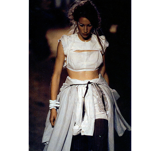 Маржела был одним из тех, кто тогда начал раскладывать на составляющие традиционный крой, традиционный силуэт, традиционное представление о том, что такое "красота" и "женственность" — и соединять их в совершенно неожиданном порядке, остраняя таким образом, то есть делая странными, неожиданными, необычными. Он снимал наслоения традиционных клише, делая взгляд острым, как скальпель, заставляя увидеть по-новому буквально все. Рукав на спине, съехавший вырез, перепутанные перед и зад, изнанка и лицо, кривые швы и необработанные края, пуловер из шерстяных носков и жилет из осколков тарелок. Он был одержим деконструкцией и ресайклингом. Это была мощнейшая идея сора, из которого растет некрасивая красота, интеллектуальной моды для тех, кто не хотел выглядеть нарядно и буржуазно. Я знаю людей, которые искренне плакали на показах Maison Martin Margiela, потому что на подиуме они видели свою собственную, глубоко персональную историю, обращение непосредственно, лично к ним. Плюс, конечно, мощная мифология бренда: агарофобия Маржелы, отсутствие не то что публичных контактов, но даже фотографий (бытует устойчивая легенда, что никакого Маржелы и не было, все, в том числе и Hermès его времен придумал и сделал Жан-Поль Готье, у которого Маржела, кстати, работал ассистентом в 85—87 годах). Носить Маржелу в 90-е для богемной публики с претензией на интеллектуальность — это было практически непременное условие, как носить форму для военных.