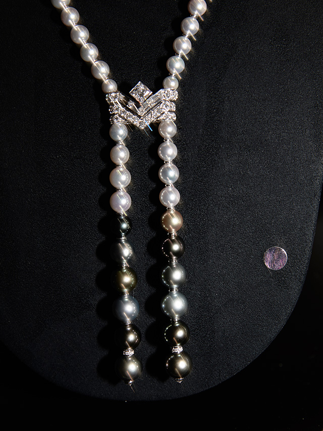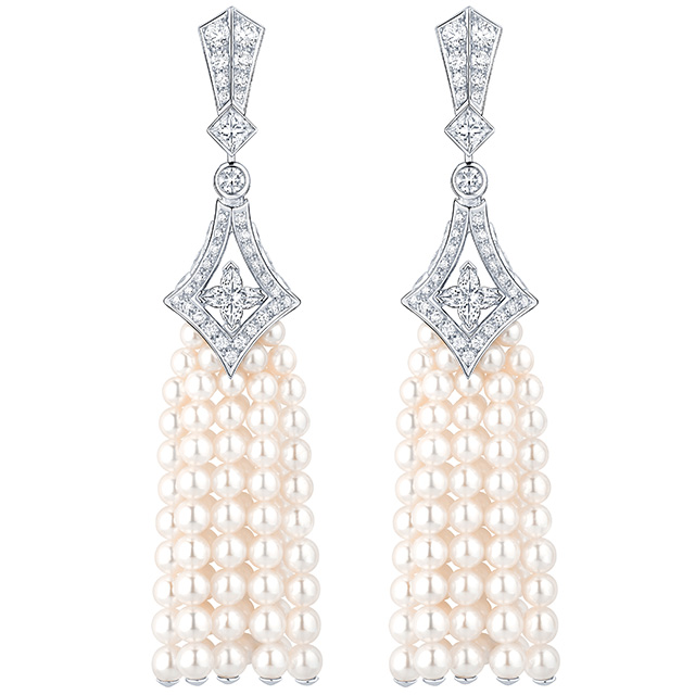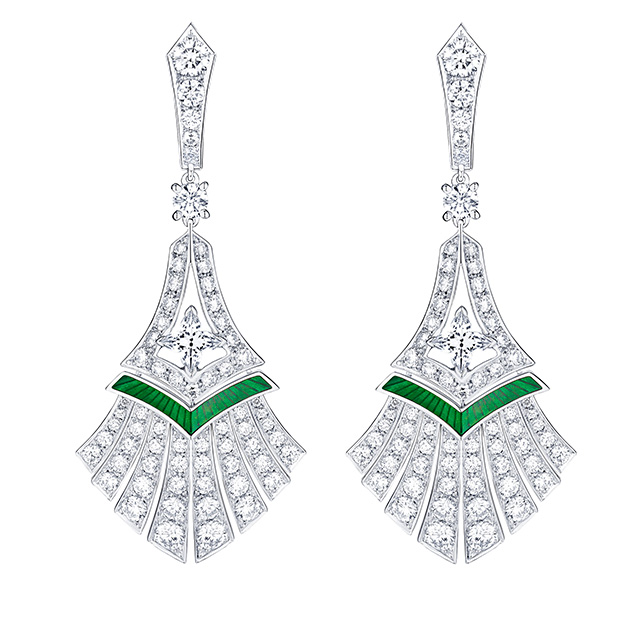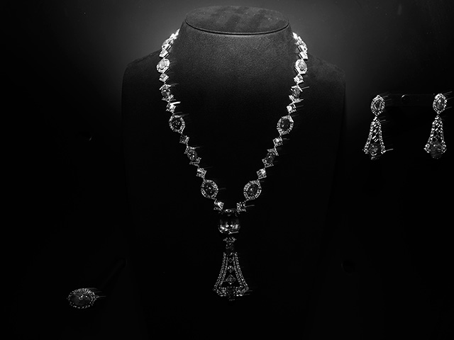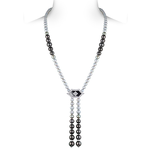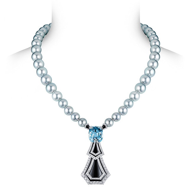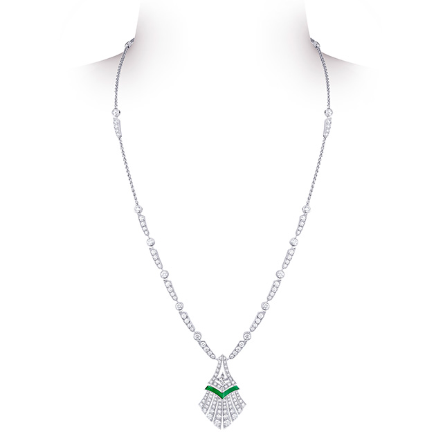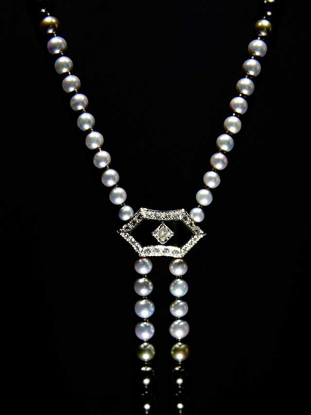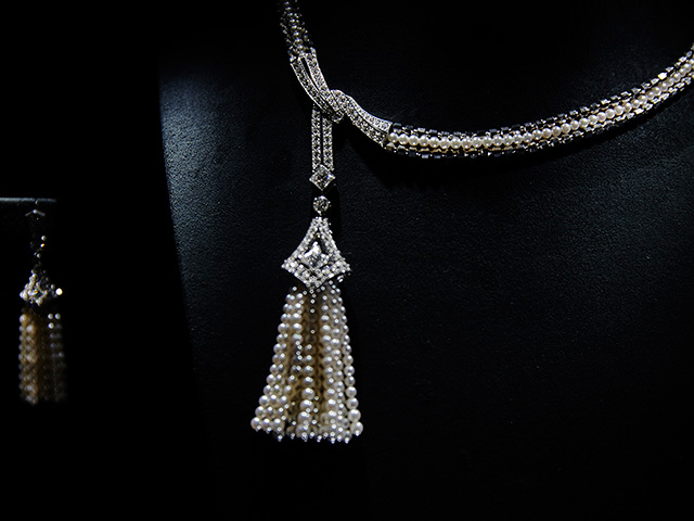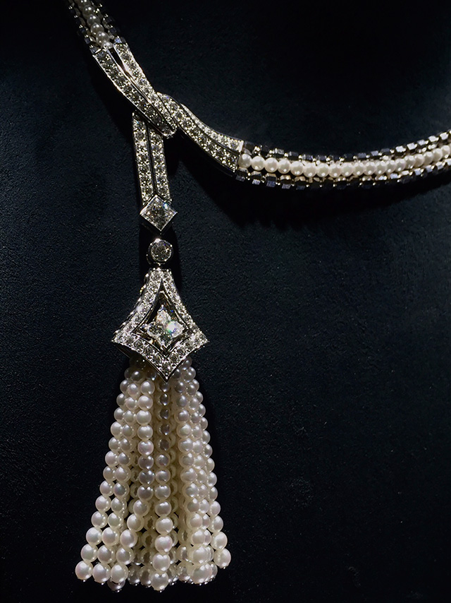 Длинные колье-баядеры, сотуары с кисточками из жемчуга и цаворитов, вещи с крупными вставками из оникса (который очень типичен для ар-деко, но очень сложен при работе с большими поверхностями) — все это составляло отличный контраст с суровым интерьером и одновременно напоминало об эпохе, когда дом был задуман и построен.
