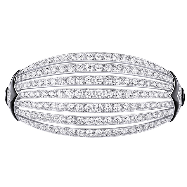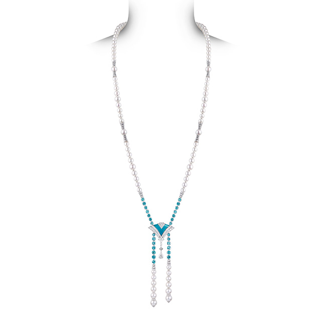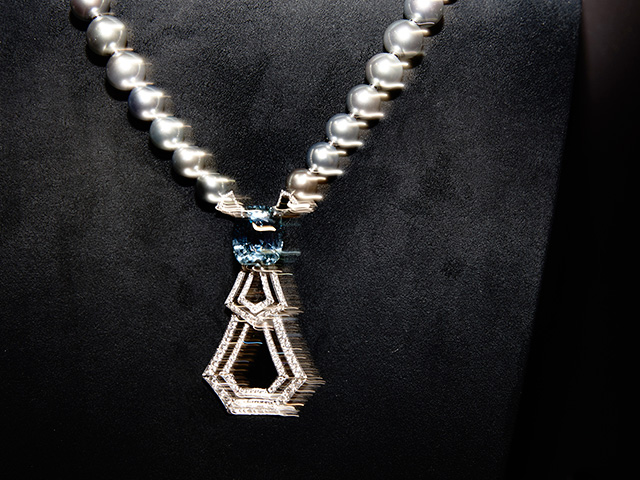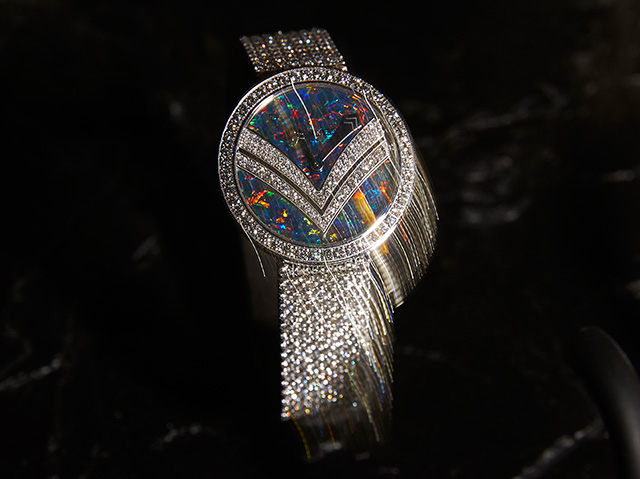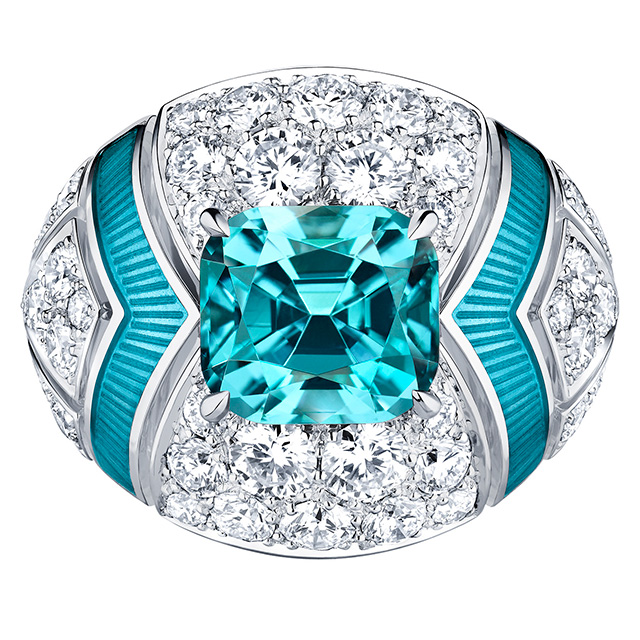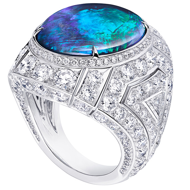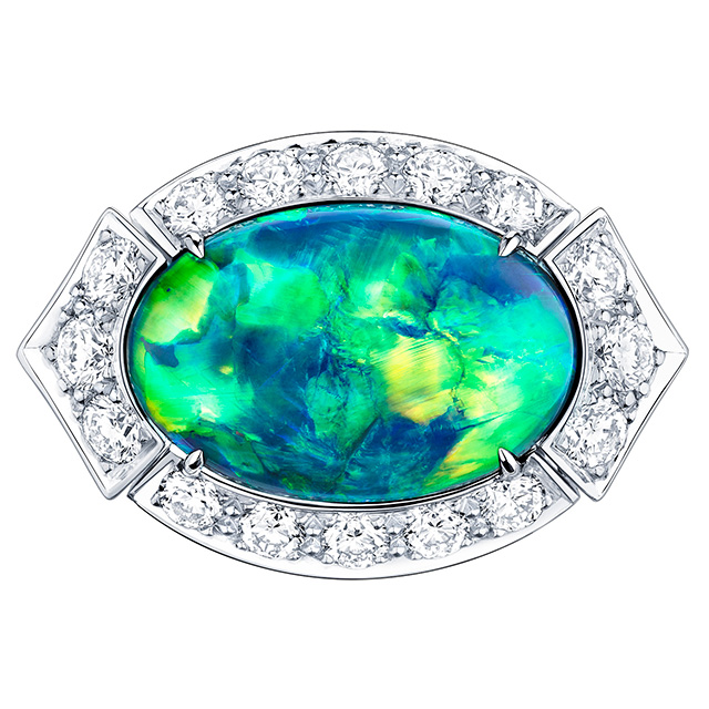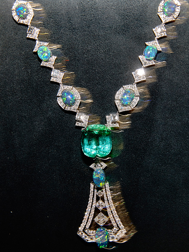 Выгнутые и скрученные в спираль бриллиантовые линии браслета и сережек Newport. Бирюзовая эмаль grand feu (оттенок, которого очень сложно добиться), покрытая гильоше, в веерообразном центральном элементе колье Beau Rivage, переливами напоминавшая морскую воду внизу. Необыкновенных чистоты, глубины и размера аквамариновый африканский турмалин цвета «параиба» главного колье коллекции, Capri. Но самое экстраординарное впечатление производило колье Majestic с большим треугольным черным опалом в центре. Его закругленные грани были закреплены только по углам, он был максимально открыт и переливался от темного фиолетового до сияющего красного — и создавал вполне психоделический эффект.