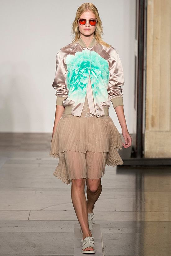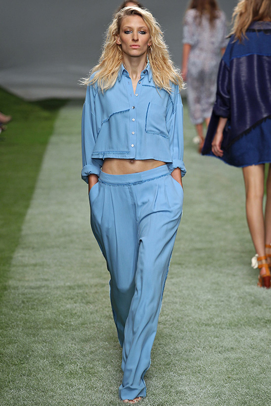 Мнение: "Это была коллекция, в которой было много классических вещей Mulberry — пижам, шелковых платьев с цветами, футболок с кожаными вставками, аккуратных булшатов, полупрозрачных вещей, а также широких шорт, напоминающих юбки, и даже собак, выведенных на подиум на поводках, но все было несколько проще, чем в прошлых сезонах". Сара Харрис, Vogue.co.uk