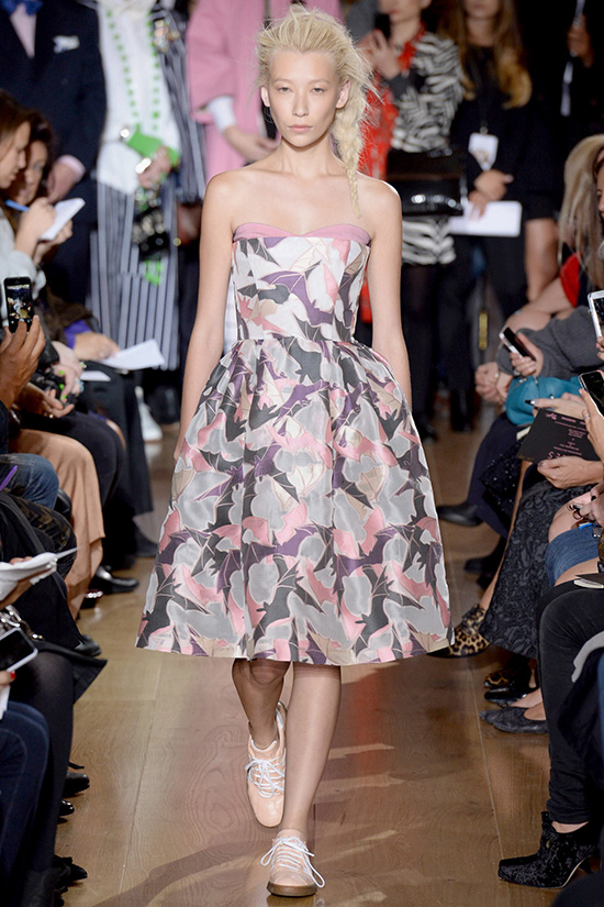 Детали: принт в виде раскрытого рта и летучей мыши, головные уборы в виде летучих мышей, перья, кеды, принты фотографий Глена Лачфорда с лицами моделей, главные цвета — черный и розовый.