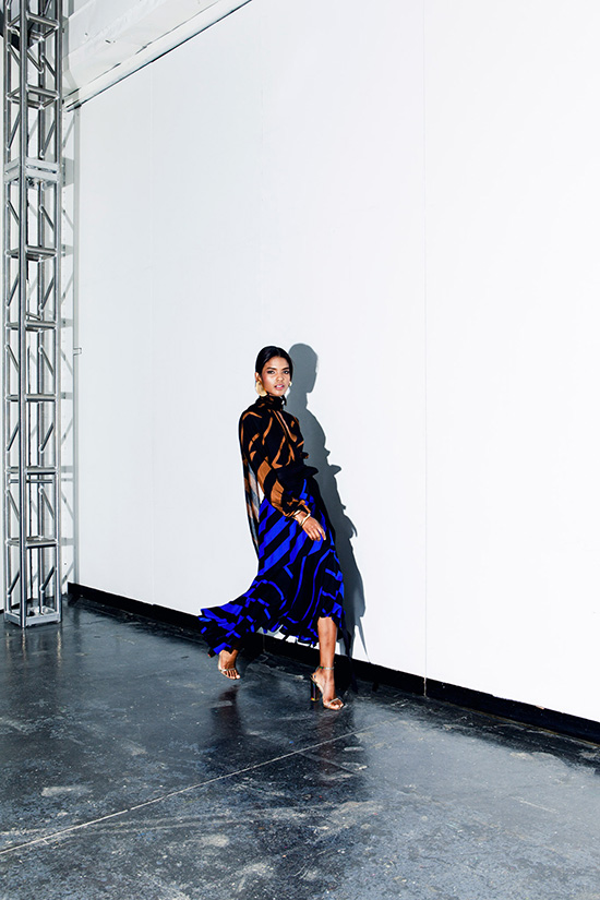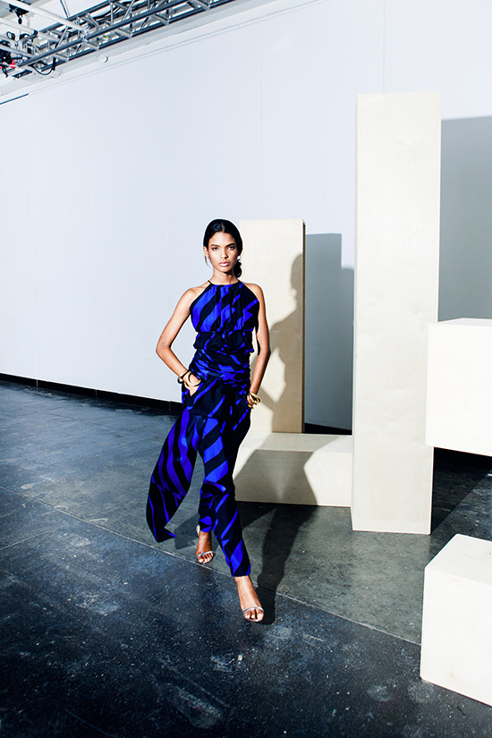 Детали: длинные платья с летящими юбками, колье-ошейники в африканском стиле, многослойные браслеты, серьги в форме полумесяца, асимметричные юбки с длинным шлейфом, открывающие ноги, горох, разноцветная (черно-синяя или черно-оранжевая) полоска.