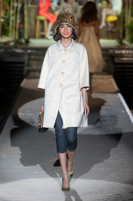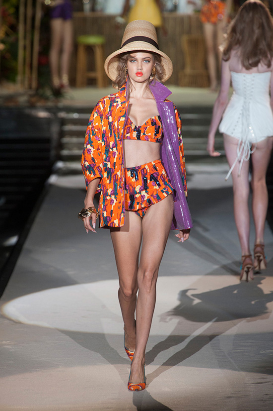 Детали: высокие шляпы, массивные украшения (браслеты и колье), босоножки с цветами, микрошорты, платья-корсеты, платья-бюстье (или купальные костюмы?), "звериные" принты.