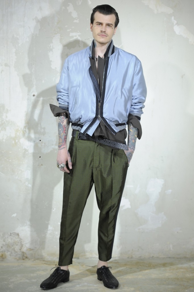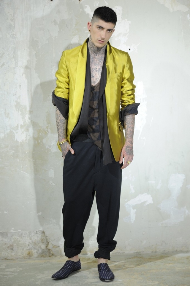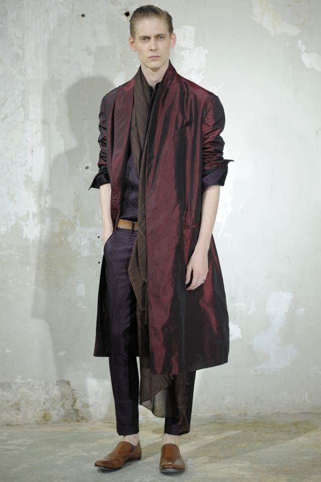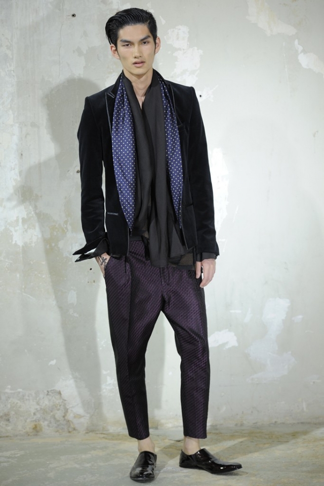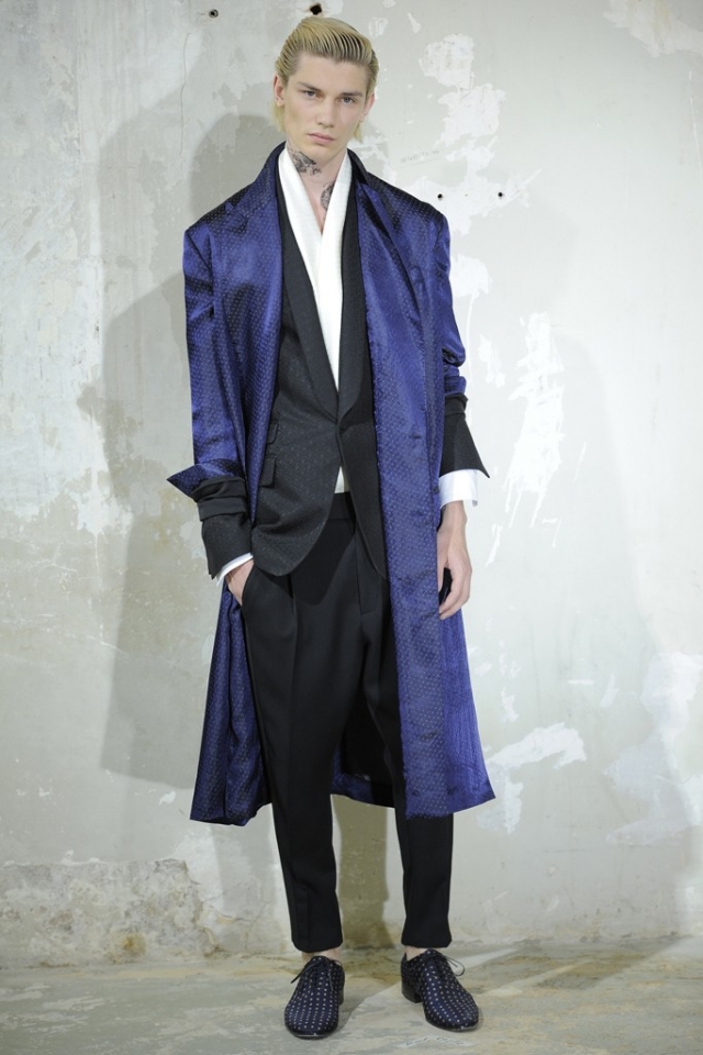 "Каждый раз — одна и та же история," — сказал Хайдер Акерманн на презентации новой мужской коллекции. Если под этим он имел в виду роскошные жакеты из дюшеса, жаккардовые брюки и огромные куски бахромчатого шелка, обмотанные вокруг всего тела, он попал прямо в точку. Но если под этим он все же подразумевал психологическую основу коллекции, это уже другая, более соблазнительная история," — написал в своей рецензии журналист Style.com Тим Бланкс. Коллекции Хайдера Акерманна — осколки и части его самого, а сам он, по его же признанию, еще себя не нашел. Вот и получается, что его коллекции сложносочиненные и труднодоступные — такие, что вмещают в себя имидж плохого парня (видите татуировки на телах моделей?), азиатские мотивы (жакеты обернуты тканью на манер кимоно) и аристократичные силуэты (пижамные брюки и пальто, напоминающие домашние халаты).