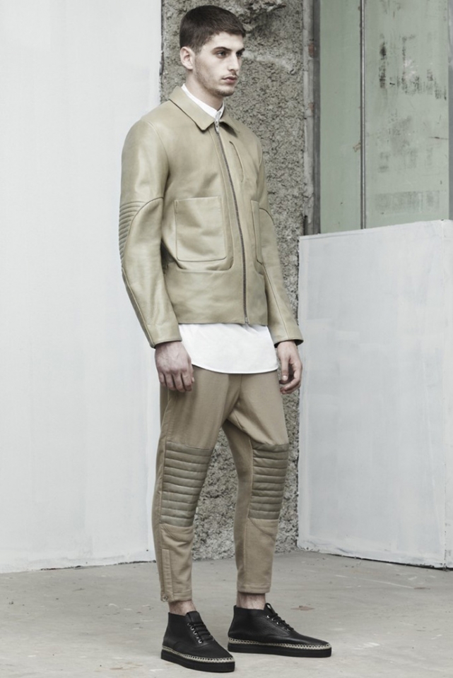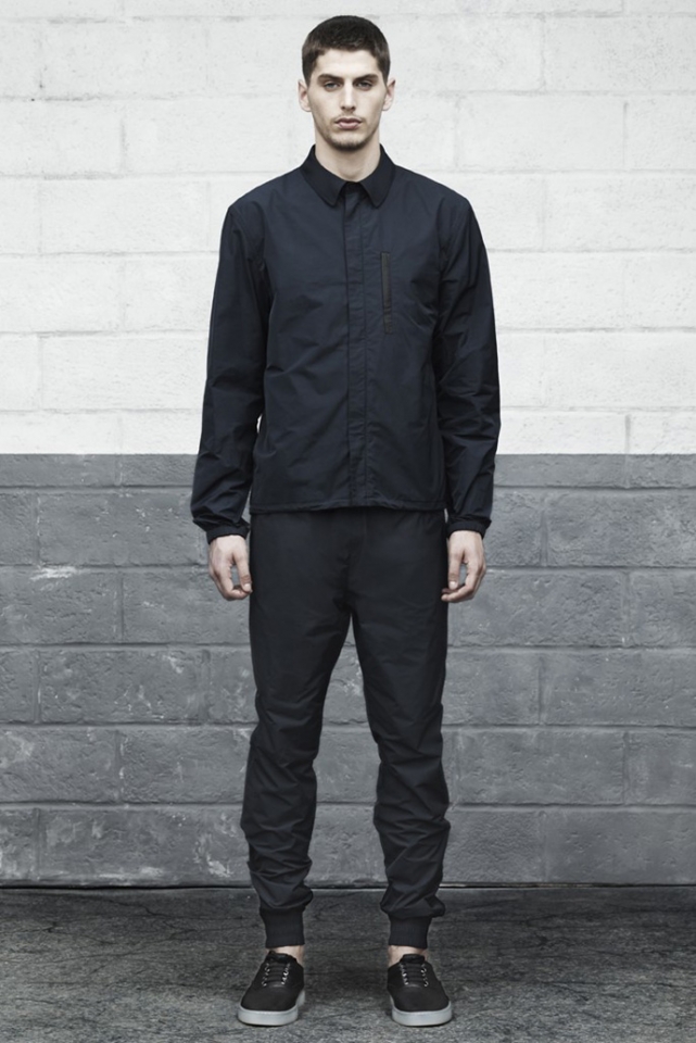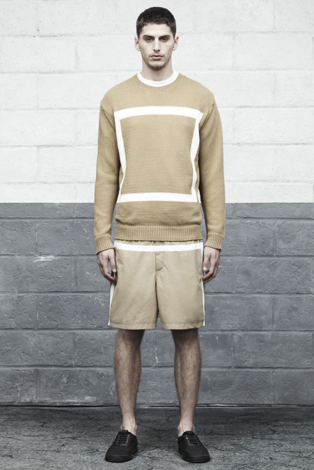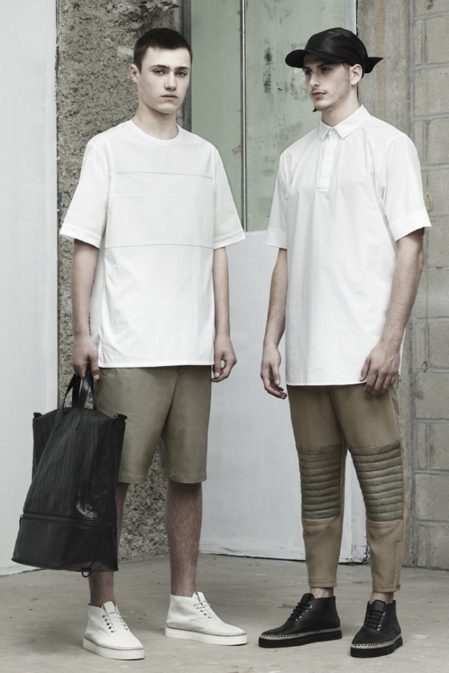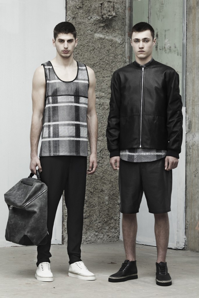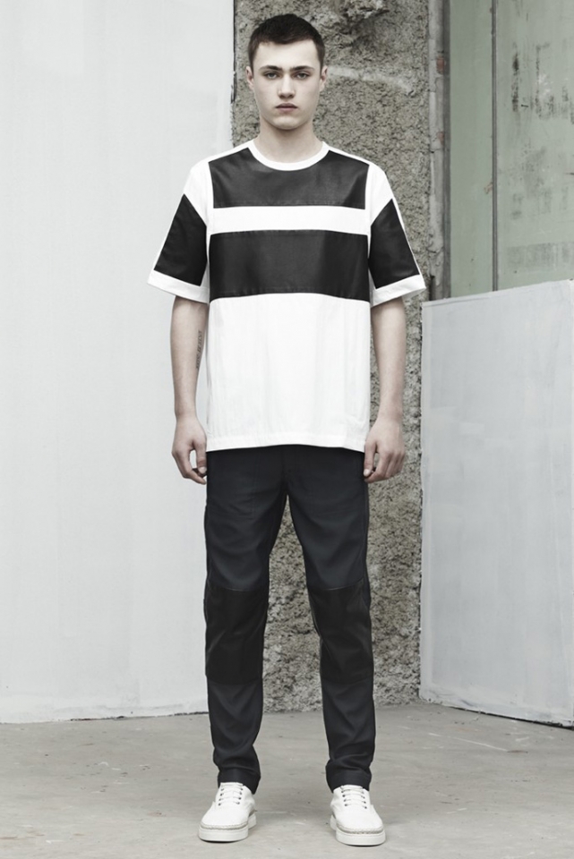 В коллекции Alexaner Wang, как и всегда, все четко и просто. Спортивные футболки, брюки и рубашки — все глухого черного цвета и прямого несложного силуэта. Кажется, что эта коллекция — для сильных, уверенных в себе мужчин, которые любят спорт, а к моде относятся спокойно, без фанатизма. Например, перфорированную рубашку в клетку, шорты-бермуды, кеды и кожаную кепку вполне можно увидеть на прохожем где-нибудь в центре Москвы — настолько этот образ незамысловат и несложен.