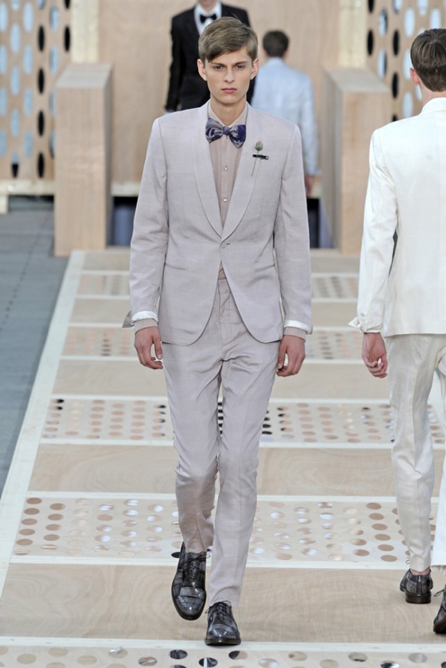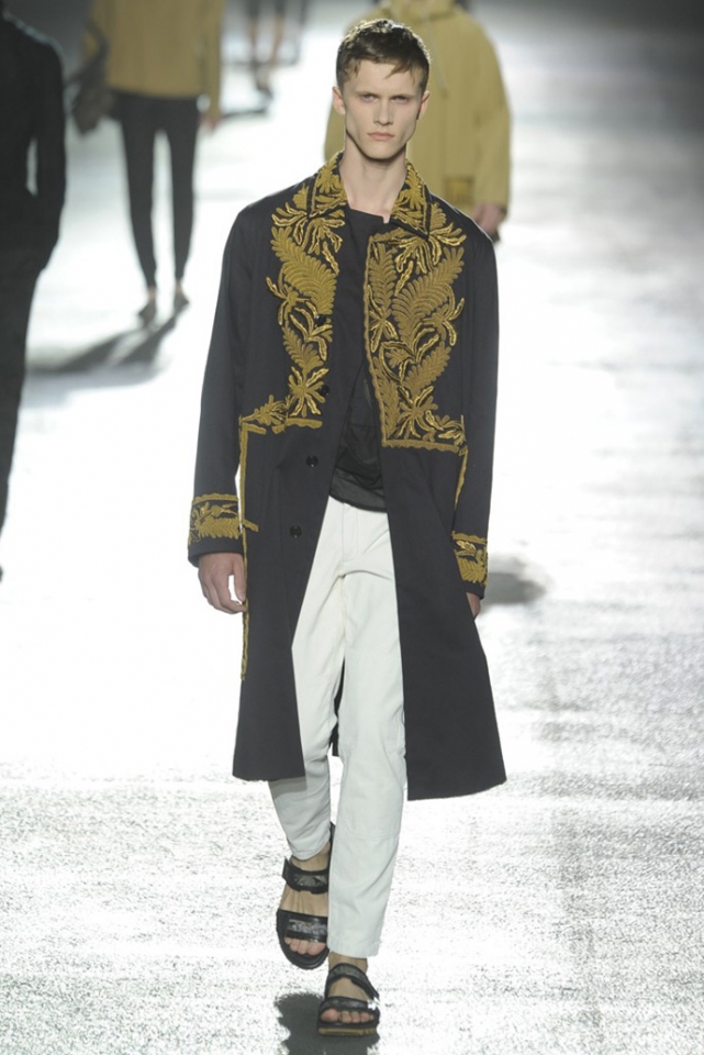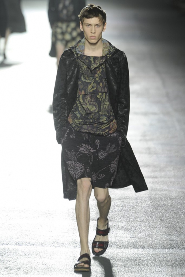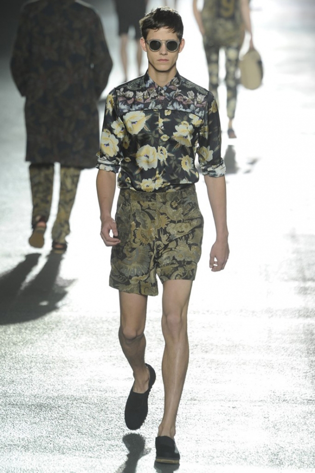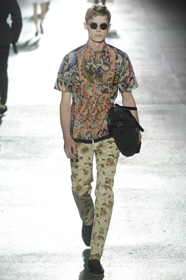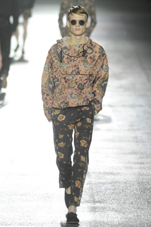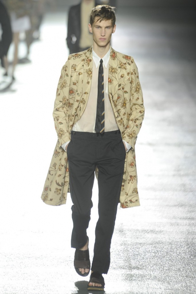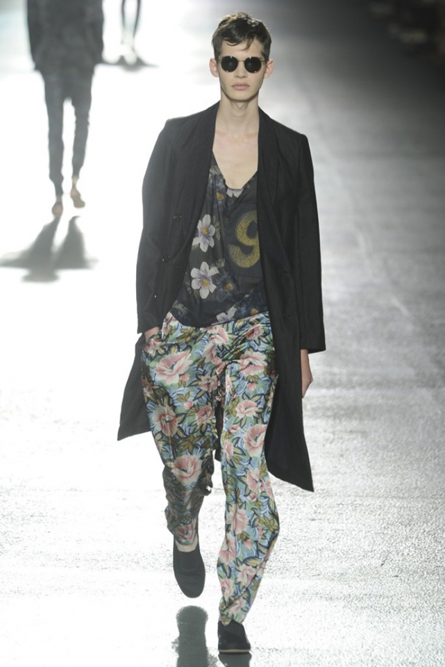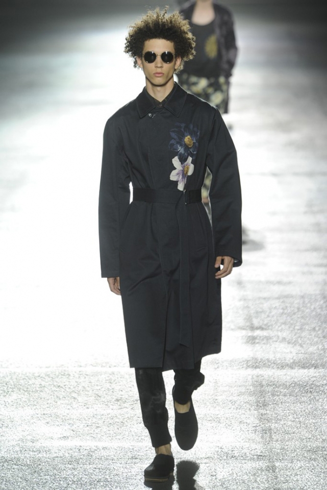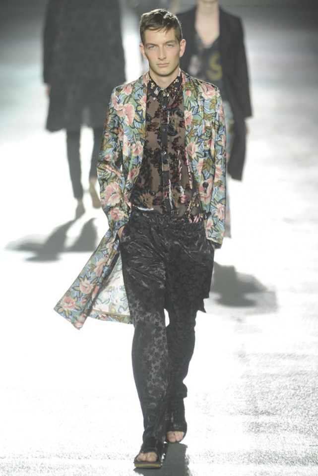 И снова цветы. Видимо, эксперимент Дриса ван Нотена с цветами в женской коллекции весна-лето 2013 оказалась настолько удачной, что он решил его повторить. Но если тогда он сочетал цветы с клеткой, сейчас сосредоточился только на них, усыпав крупными цветочными бутонами, листьями и ветками черные фоны брюк, плащей и рубашек. Концепция появилась на свет сама собой: во время подготовки к ретроспективной выставке собственного творчества, которая пройдет в парижском Музее декоративного искусства в следующем году, дизайнер просматривал музейные архивы и нашел этот цветочный рисунок, за годы ставший элементом мужского образа. "Эта идея отлично вписалась в последний проект Дриса ван Нотена — мутацию классического мужского костюма с помощью тканей, используемых для пошива женского платья," — пишет обозреватель Style.com Тим Бланкс. Раздумывая о мужчинах, которые смогли бы носить цветочный принт, мы вспомнили об Оскаре Уайлде, Жане Кокто, Джими Хендриксе и Ленни Кравитце. Как видите, спрос был и есть, поэтому в коммерческом успехе коллекции сомневаться не стоит.