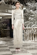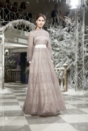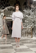 Для воплощения идеи сказки, дизайнер использовала светлые и теплые тона: бежевый, молочный, светло-серый, жемчужный. Даже черный цвет был "смягчен" принтом морозного узора. Оренбургский платок, как никогда, гармонично смотрелся в коллекции и передавал ту иллюзию морозных узоров, воздушной красоты и в тоже время согревающей легкости, которая ассоциируется со сказочной Снегурочкой. Мех дизайнер использовала как в деталях для отделки, так и в полноценных элементах образа в виде каракулевых шапок и пальто.