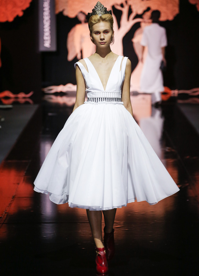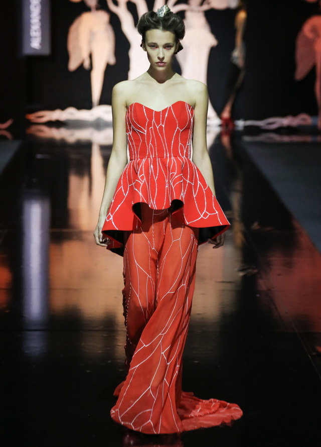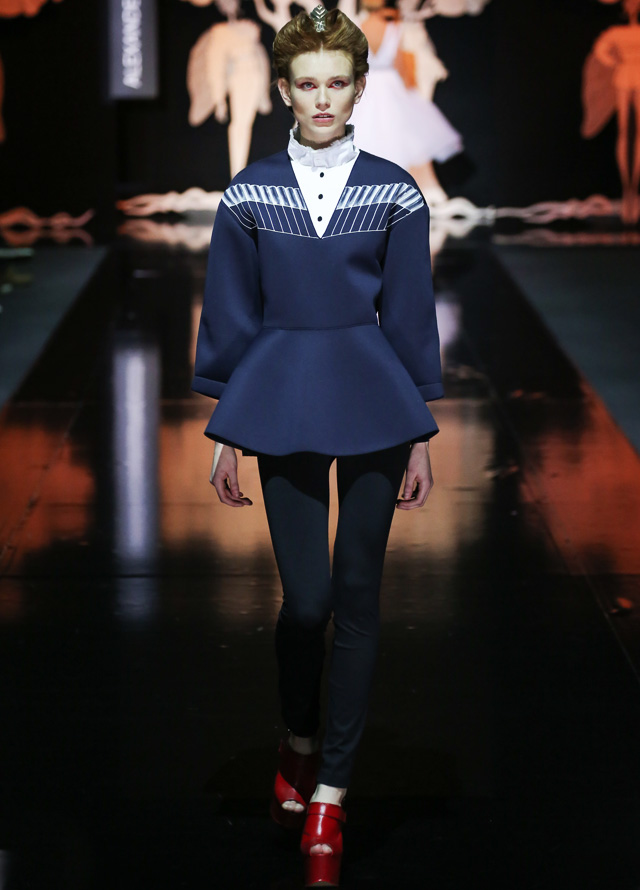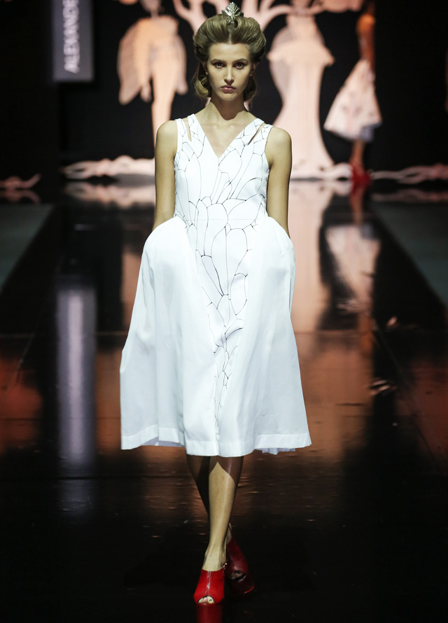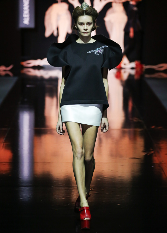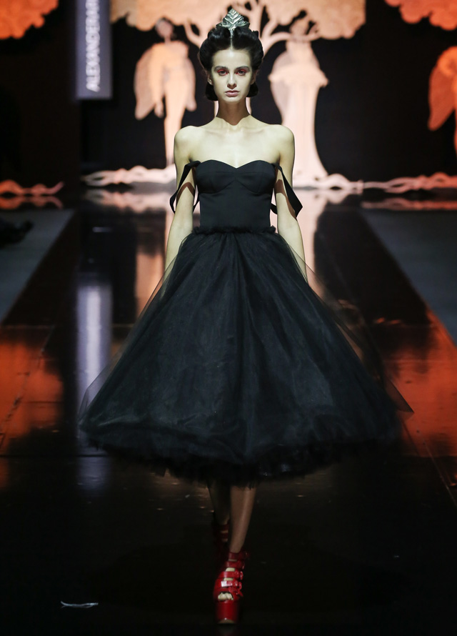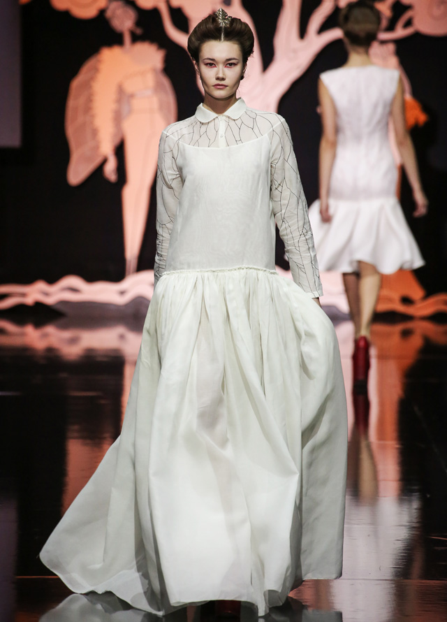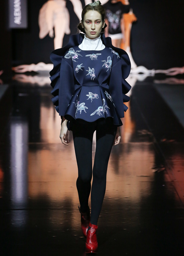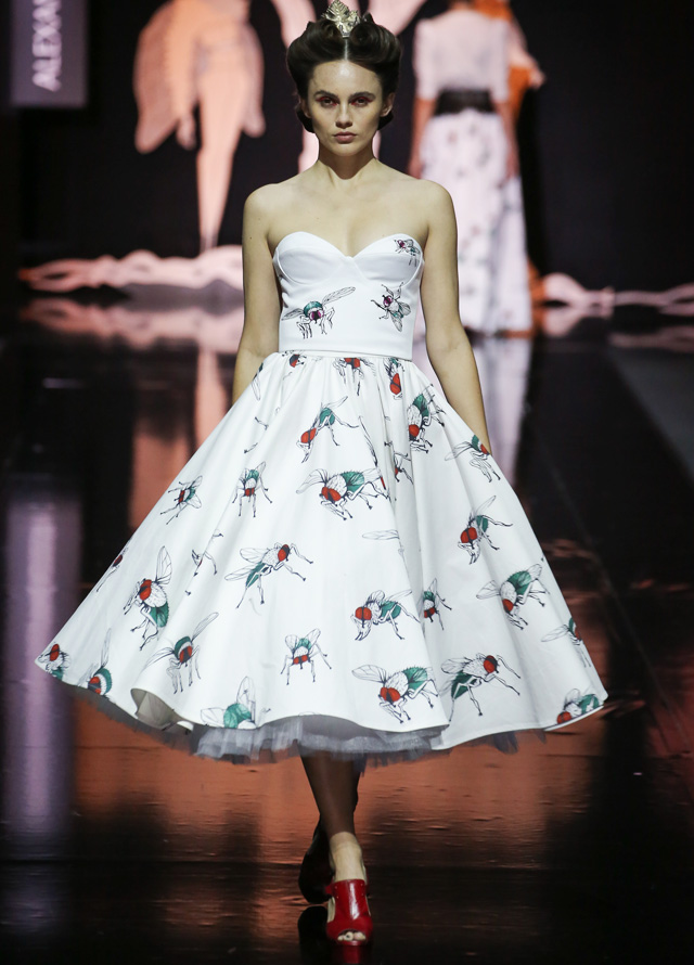 Дизайнер "посадил" мушек на платья в стиле new look с пышными юбками, узкими талиями и облегающими корсетами. Раскрасил асимметричным принтом, напоминающим одновременно фасеточные мушиные глаза и узор на крыльях, топы и брюки. Лихо выкроил силуэты жакетов, напоминающих не то экзотических бабочек, не то летящих жуков. Смешал несколько чистых цветов (красный, белый, темно-синий и черный). Добавил баски, кружевные вставки и наслоил это все друг на друга, получив в итоге необычайно красивое и гармоничное действо. Аксессуарами послужили красные туфли на каблуках, гармонирующие с макияжем, и винтажного вида диадемы.