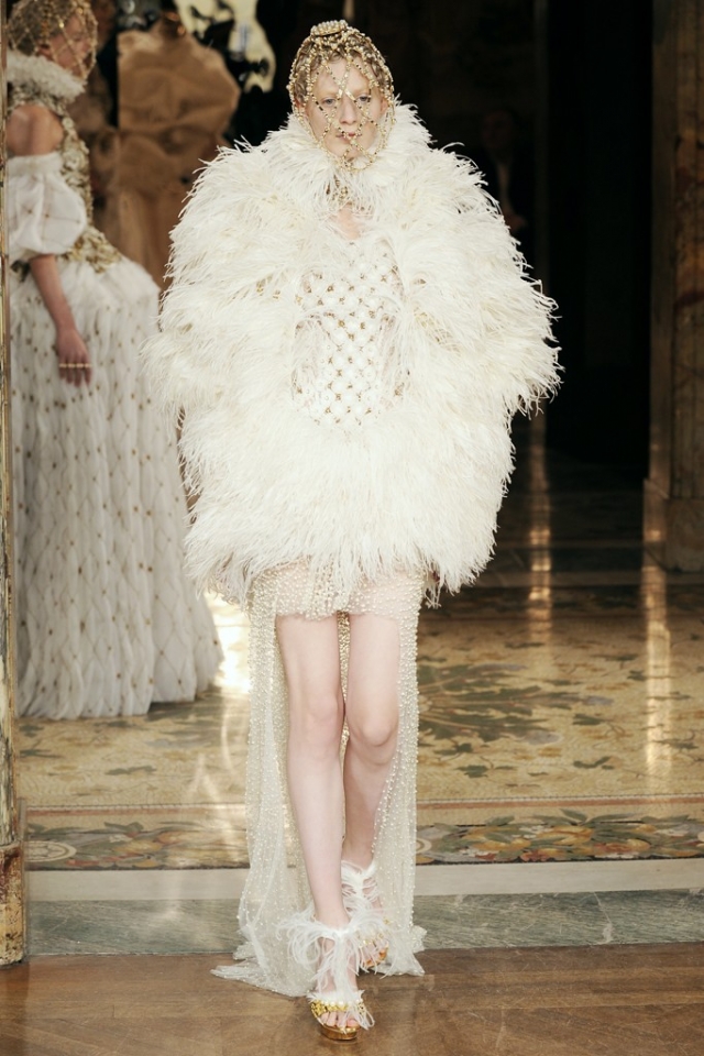 Дальше последовали белые наряды, с расшитым золотом корсажем и пышными юбками в пол, заштрихованными золотой сеткой. А закончилось все пышными белыми перьями страуса. Раз есть клетка — непременно должна появиться и птичка.