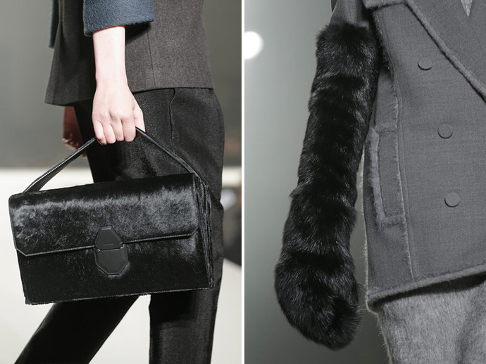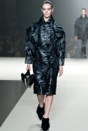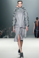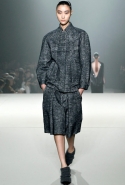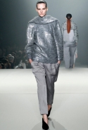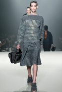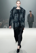 Вообще Вонг показал, что не боится нарушать принятые стандарты в соотношениях конструкции и материала. Например, для каракульчи, которую обычно выбирают для моделей с прямым или приталенным силуэтом, он написал неожиданную роль: объемное, с жестким кроем полупальто. Как он делал это уже не раз, дизайнер вновь решил заламинировать шерсть (свитера) и выпустил на подиум с десяток моделей в одежде из суперсовременных материалов, которые трудно идентифицировать (металлизированный твид? лакированный стриженый мех?). Кстати, меха в его коллекции было неожиданно много – из него Вонг сшил даже прямые юбки до колена.