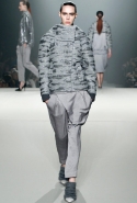 В новой коллекции это ему, безусловно, удалось. Как и создание очень сильного "оптического" образа-символа — то, чем всегда славился Николя Гескьер, на смену которому придет Вонг: девушка в облегающей вязаной шапочке, низко надвинутой на лоб, и плотно сидящем вязаном капюшоне, в напоминающем мужское мышино-сером пальто с эффектом поношенности (благодаря оригинальной отделке шерстяными нитями) и гигантскими длинными меховыми варежками, могла бы быть персонажем современного комикса, действие которого разворачивается где-то в середине XX века.