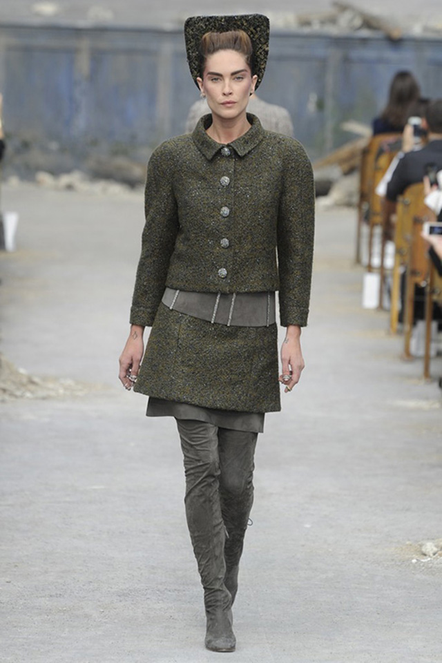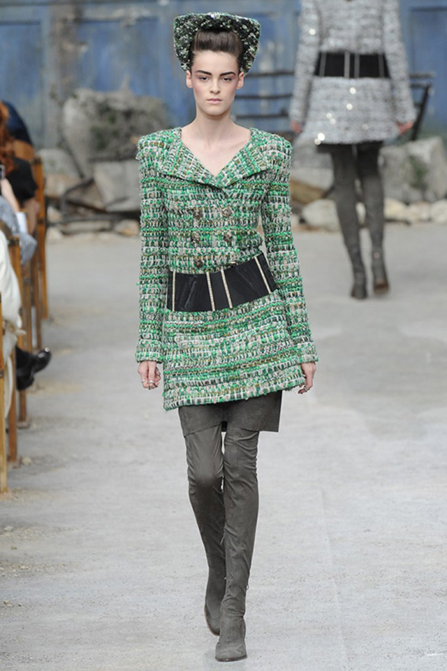 Хотя, безусловно, не они были главными героями этой коллекции. Им был старый добрый "шанелевский" твид. Поэтому хочется отдельно отметить разнообразие представленных фактур этого материала. Жакет в зеленых тонах можно было принять за вязанный. Некоторые "твиды" хочется сравнить с чешуей. Другие, наоборот, отличались такой гладкой фактурой, что их можно было принять за плотную шерстяную ткань. Были в этой коллекции и твиды с металлизированной нитью, и с "искрой" люрекса, с крупной, даже слегка грубой фактурой и с очень плотным плетением. Современные технологии производства и фантазия Лагерфельда продлили жизнь твида: порой он выглядит как ультрасовременный материал, изобретенный в каких-нибудь 2000-х годах. То ли еще будет.