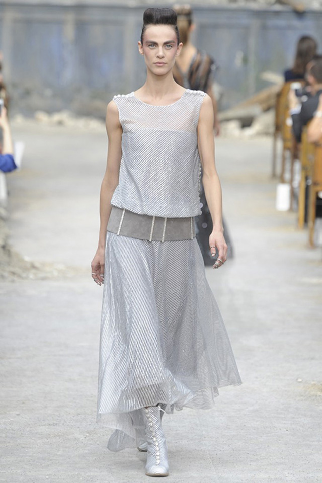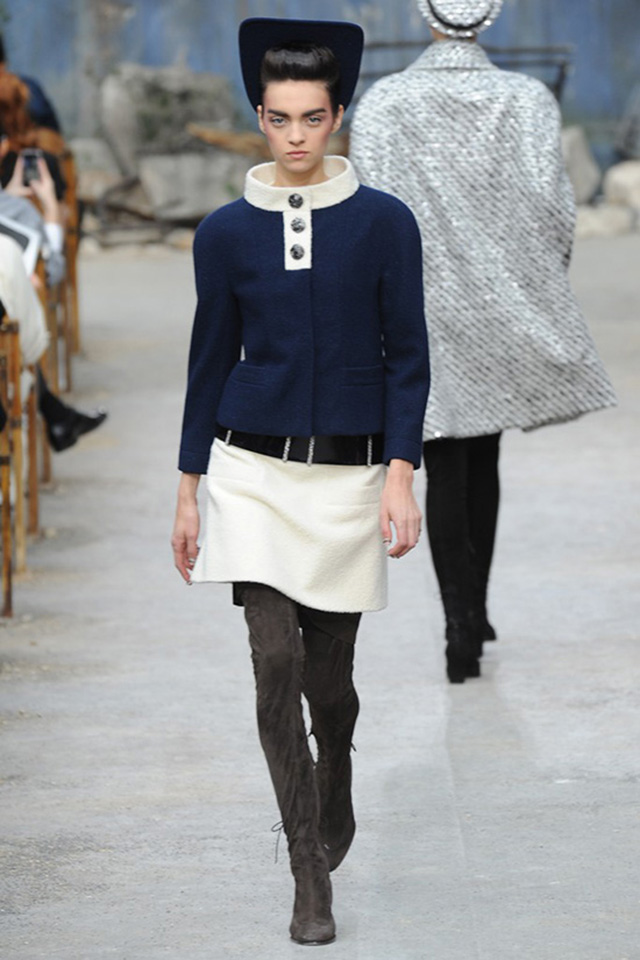Не побоюсь повториться: Карл Лагерфельд умеет удивлять. Приятно или не слишком – бывает по-разному. На этот раз удивление было, безусловно, окрашено в положительные тона. Уже по первым двум выходам – классический буклированный жакет Chanel в серо-голубых и теплых серо-черно- коричневых тонах, преобразившийся в блейзер, в сочетании с металлизированной удлиненной сорочкой в одном случае и бежевым, с абстрактным серо-коричневым рисунком платьем-свитером, и дополненные длинными узкими замшевыми насыщено-серыми и сине-фиолетовыми сапогами – стало понятно: в этой коллекции мы увидим нечто живое, динамичное и современное по эстетике.