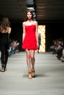 Идея коллекции проявляется и в оттенках тканей — дизайнер использовал цвета формы студентов и выпускников университетов: бежевый, черный, фиолетовый. Целеустремленность, юность и смелость героини Чапурина подчеркивают алые элементы одежды, а также яркий макияж, за который отвечали визажисты Clarins.