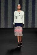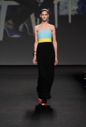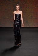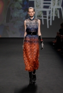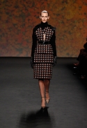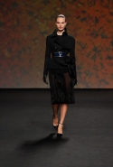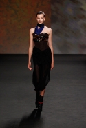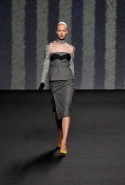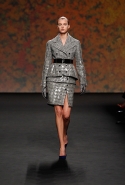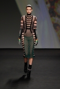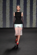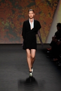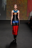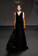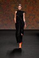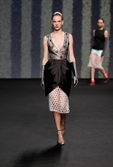 Впрочем, нам показали несколько классических бальных платьев в пол, — красное, зеленое, цвета шампанского, белое, в черную крапинку, черно-оранжевое полосатое с черной накидкой и черное меховое. Надо же Дженнифер Лоуренс и Марион Котияр в чем-то появляться на красных дорожках! Впрочем, сомневаюсь, что кто-нибудь из девушек отважится на меховое. Все они — и многие другие выходы — сопровождались высокими перчатками, составленными из кусков разного цвета и фактуры, которые на первый взгляд выглядели классикой 50-х, но на самом деле тоже отсылали к 90-м. Вообще всю коллекцию можно было бы озаглавить "Безумный пэчворк", если бы в ней не отсутствовал напрочь флер хиппи и вообще всего рустикального, с чем обычно пэчворк ассоциируется.