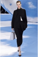 Симонс берет основной диоровский силуэт и так закручивает его, так смещает пропорции, что основательно примелькавшийся за последнее время new look начинает выглядеть самым свежим и даже радикальным образом. На этот раз в классическом диоровском платье с декольте, пышной юбкой и турнюром вышла Кэтрин Макнил — но сшито оно было из черной кожи и выглядело сурово и готично. Все прочие элементы его стиля — идеально скроенные приталенные жакеты и пальто, узкие черные брюки, сложно задрапированные юбки платьев-бюстье — работали по такому же принципу.