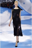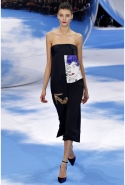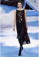 Раф Симонс раз за разом берет основные диоровские коды и остраняет их — пытается взглянуть на них со странной, неожиданной, необычной точки зрения. Он начал с главного — знаменитой диоровской метафоры "женщина-цветок". Он всячески жонглировал ею, то буквально реализуя в виде стен из цветов и зеленых кустов, то делая максимально декоративной — мотивом на ткани или вышивкой на платье. Вчера цветы поднимались от щиколоток к коленям, обвивали бедра и ложились на плечи — в узорах на сапогах и платьях — то оставаясь плоскими, то приобретая объем за счет бисера и пайеток.