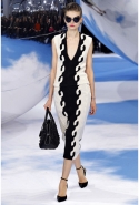 Рядом возникает черно-белая клетка pied-de-poule, которая украшала сначала флаконы духов Miss Dior, а потом и Diorella, Diorling, Diorissimo. Эта "куринная лапка" отпечатана на узком корсетном платье, поверх которого натянута нежно-розовая, словно связанная крючком юбка, на туфлях, на топах и на корсажах.
