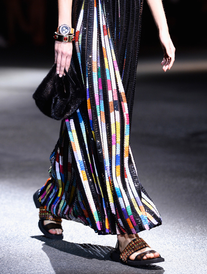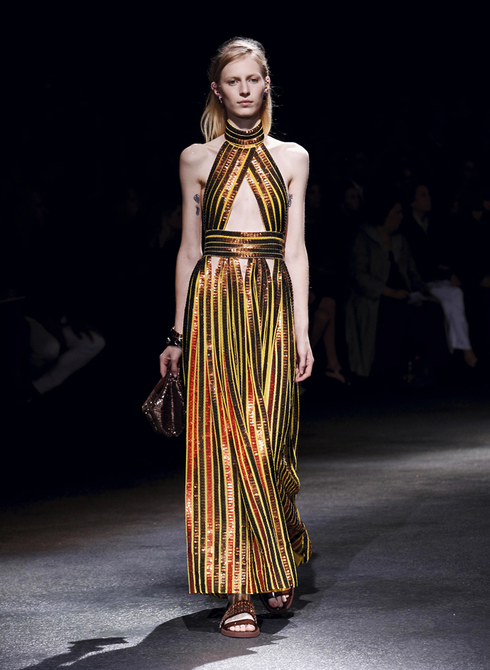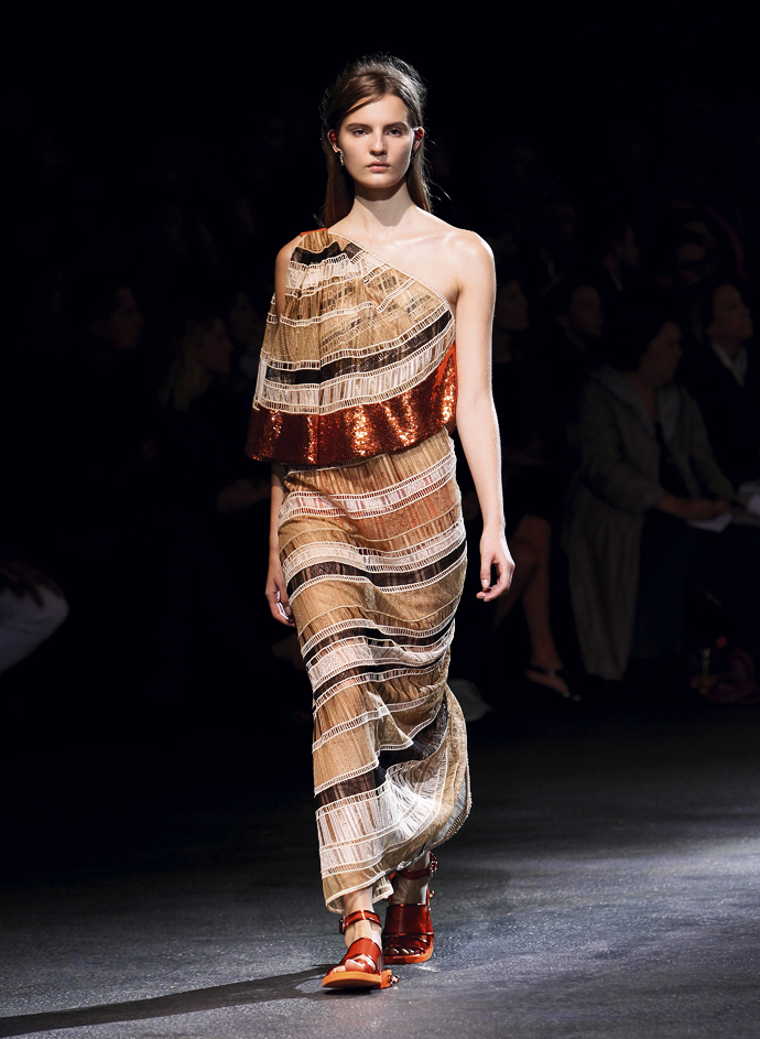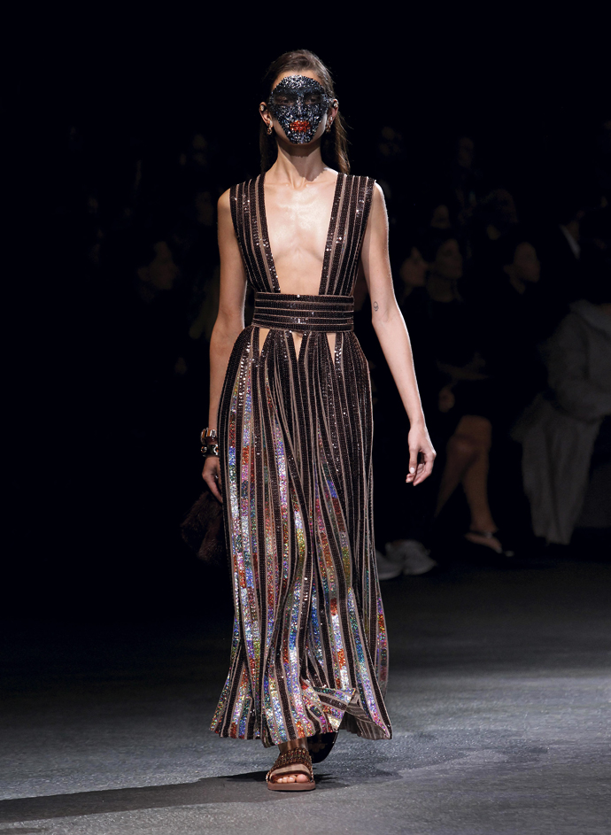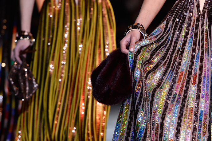 Кульминацией шоу стали плиссированные платья, переливавшиеся на свету благодаря разноцветным пайеткам. Они были удивительно красивыми – большинство держались на двух широких бретелях, а у одного была американская пройма.