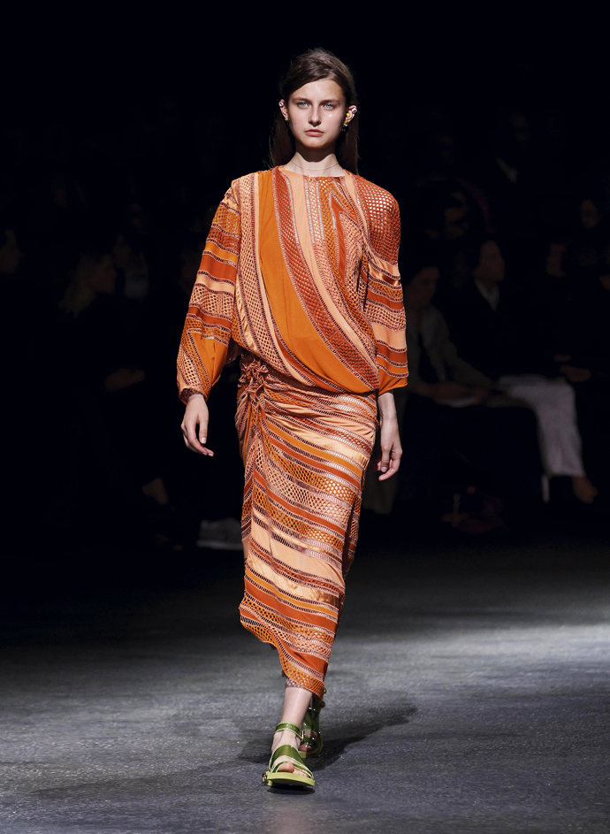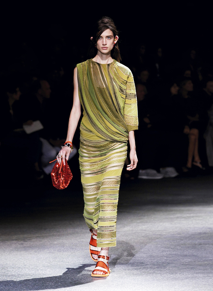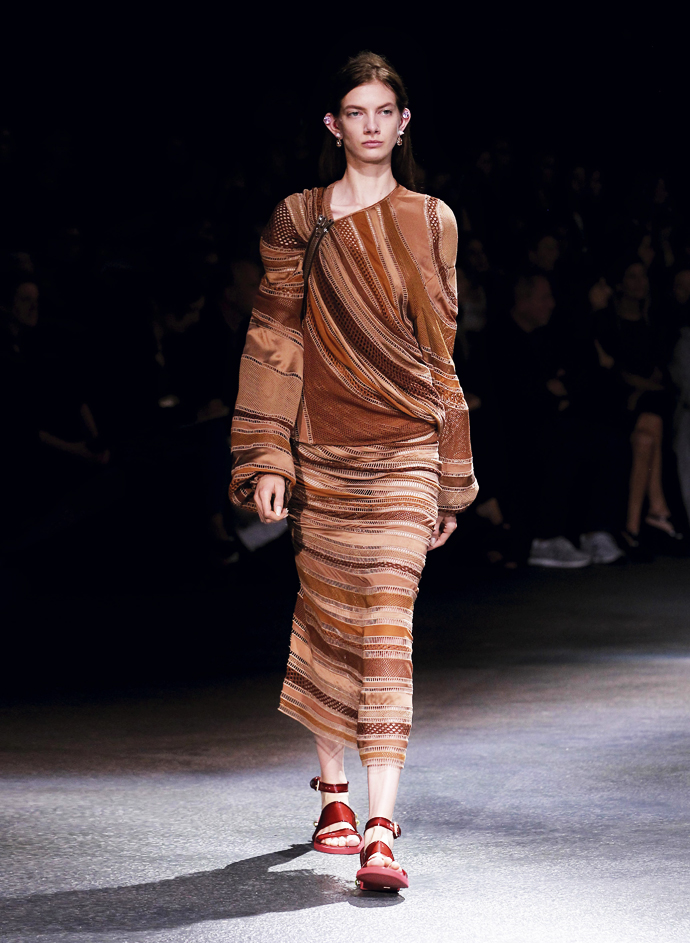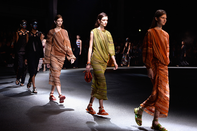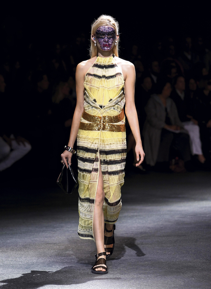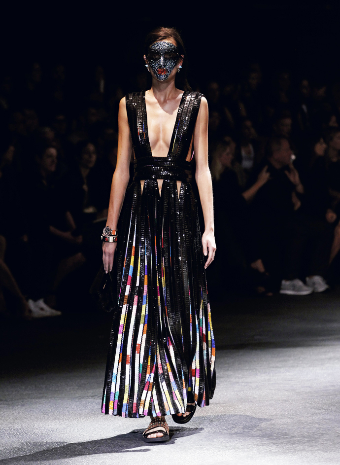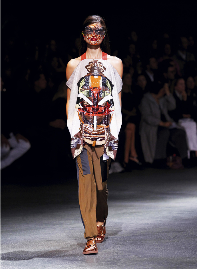 Но главную скрипку играли щедро задрапированные платья из джерси. Они были явно навеяны древнегреческими туниками и древнеримскими тогами. Некоторые имели довольно воинственный вид, который им придавала кожаная «сбруя» - ремни, обвивавшие шею. Встречались и цветастые глухие платья с узорами в африканском стиле – Африка, похоже, тоже стало одной из тем этой коллекции. Что подтверждали и маски на лицах моделей, как у воинов туземных племен.