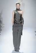 Но Аккерман не был бы Аккерманом, если бы посреди всей этой многослойности вдруг не появилась бы модель в ультрапростом прямом черном пальто без лацканов и длинных мужских черных брюках, падавших складками на мужские же черные ботинки. Или модель в черно-белых брюках и топе, покрытых мелким графичным узором разного типа и выглядевших совершенно психоделически.