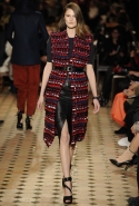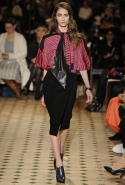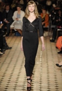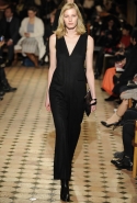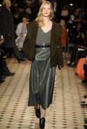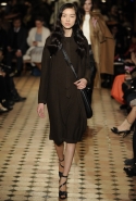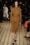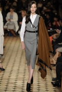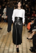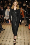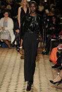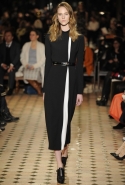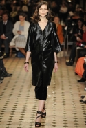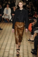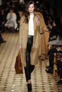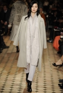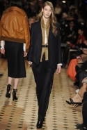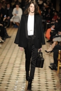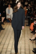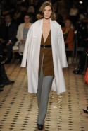 Простые накидки, стянутые на плече кожаными ремешками, прямые кожаные юбки, строгие жакеты, свободные платья до середины икры, схваченные на талии ремнем. Очень остроумный и удобный вариант смокинга — прямой, двубортный, на одной пуговице, с узким воротником-шалькой, черный или глубокого табачного оттенка. Лемер показал самые разные брюки – свободные, чуть присобранные на талии с лампасами, широкие и укороченные, брюки-сигареты, прямые с высокой талии и мягкие замшевые винного цвета, уже ставшие его базовыми. Их дополняли жакеты без воротника, бушлаты и авиаторские куртки. Конечно, были мужского кроя пальто — свободное белое на Аризоне Мьюз, с мягкими спущенными плечами и широким воротником, прямое без воротника на Кэтрин Макнил, подбитое мехом и с контрастными кожаными вставками, и целых два на Аманде Мерфи — из кожи пони карамельного цвета и из верблюжьей шерсти, накинутое на одно плечо. На этот раз крокодиловая кожа, которая обычно представлена у Hermès в разных видах, появилась, не считая сумок, только один раз — в виде прямой юбки насыщенного горчичного оттенка. Казалась, что спокойная уверенность, исходившая от этих вещей, совершенно не нуждается ни в каких особенных акцентах. Все это — эрмесовская азбука, представленная самым свежим и нетривиальным образом, с сугубо французской свободой и благородством, которые никто сейчас так органично не воплощает как Hermès. Есть некоторая изящная ирония в том, что именно этот дом, созданный вокруг седел, уздечек и подпруг, оказался сегодня главным оплотом французской элегантности в ее живом, а не нафталинном виде. Особенно отчетливо это стало ясно после недавних эксцессов в других знаменитых парижских домах.