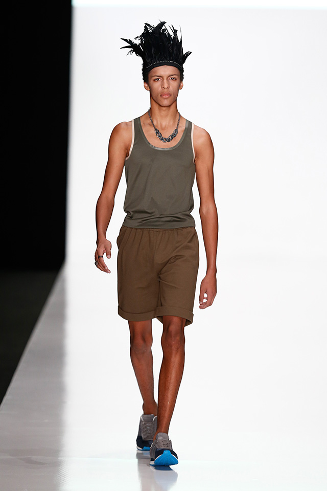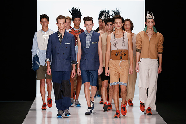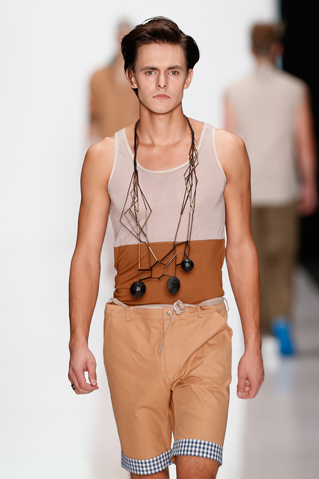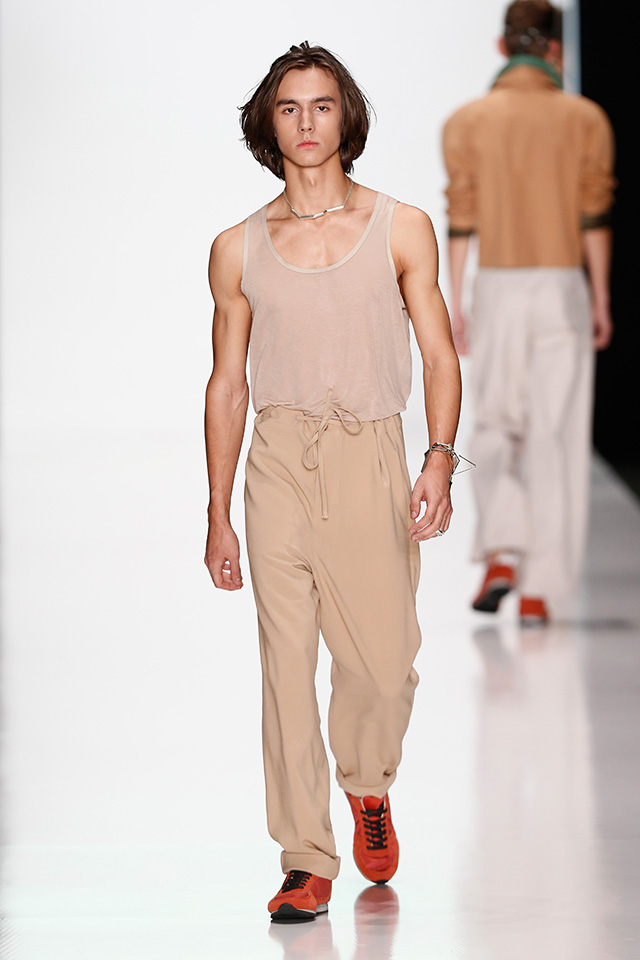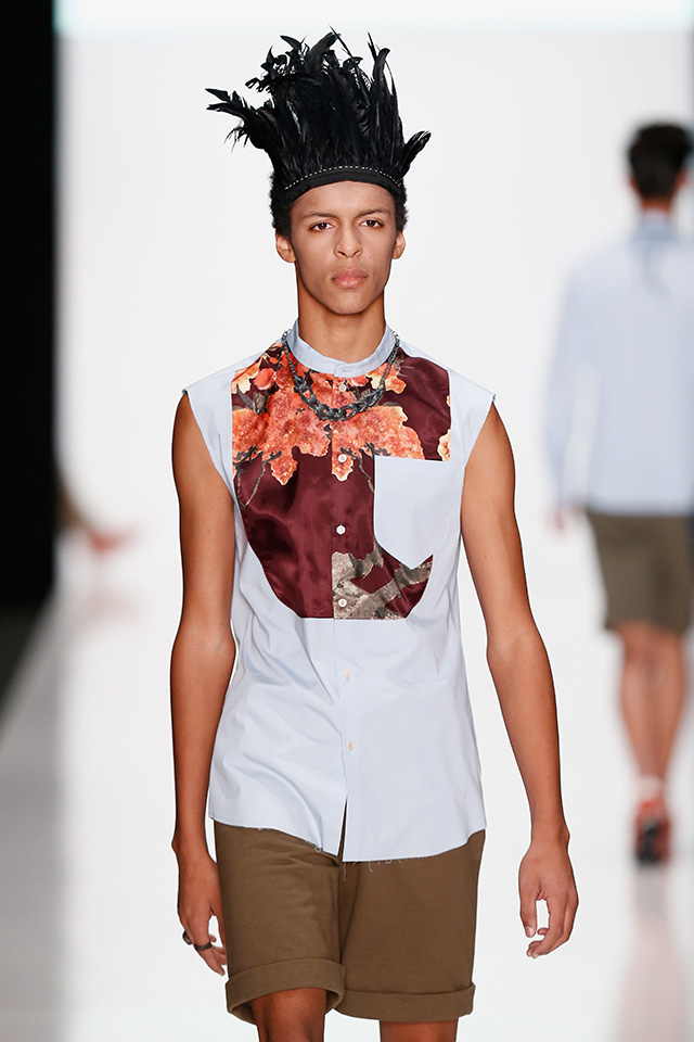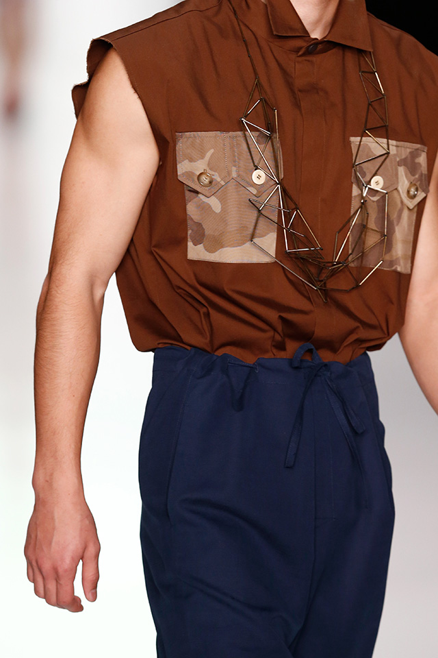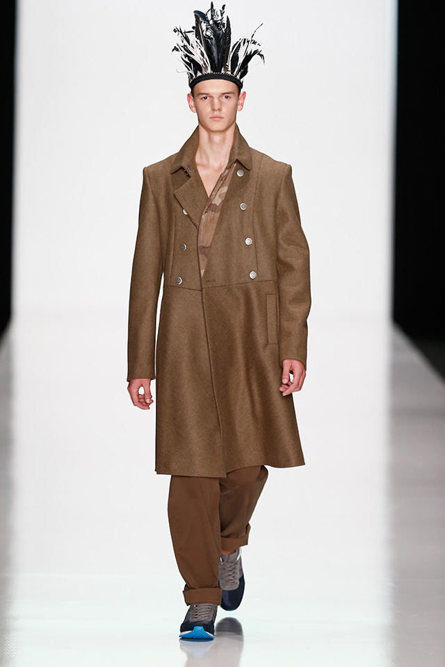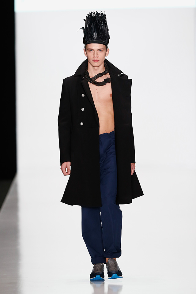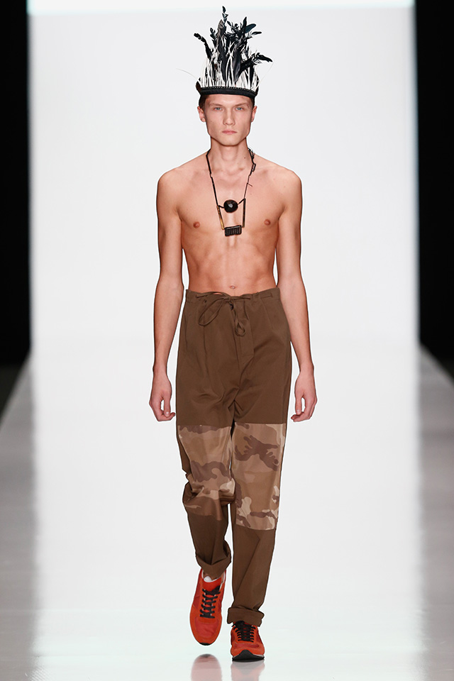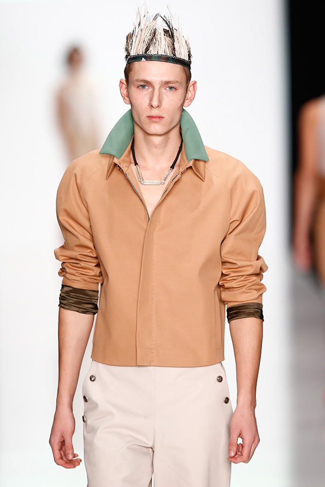 Впрочем, новая мужская коллекция дизайнера, которую он показал в рамках Mercedes-Benz Fashion Week, не лишена коммерческого начала. Двубортные плащи и костюмы с камуфляжными вставками, короткие куртки с двойными воротниками в духе пятидесятых можно и нужно носить в реальной жизни. В общем-то, как и "шаровары", напоминающие гибрид тренировочных брюк и чиносов.