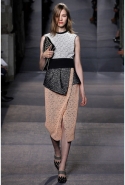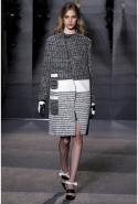Материалы и текстуры коллекции — мягкие, комфортные и очень технологичные. Буклированная шерсть, но такой плотной вязки, что так и хочется потрогать ее, чтобы поверить, что это действительно букле (белые пальто, жакеты, белые и черные короткие платья в начале коллекции), структурированный тюль усложненного плетения — Джек Маккаллоу сравнил его со слоем свежевыпавшего снега (длинные белые платья с асимметричным кроем). Модели из материала с черно-белым пестрым принтом, на первый взгляд похожего на кожу, на поверку оказались выполненными из шелковистого крепа. Благодаря сложному технологичному процессу обработки ткани сшитые из нее платья и костюмы с юбкой выглядели очень объемно. Материал, похожий на плотную вышивку, создан благодаря процессу "сверхзвуковой сварки". В другом случае роль структуры в блузках с длинными рукавами и платьях сыграли вертикальные тонкие, создавшие эффект движения, цепи.