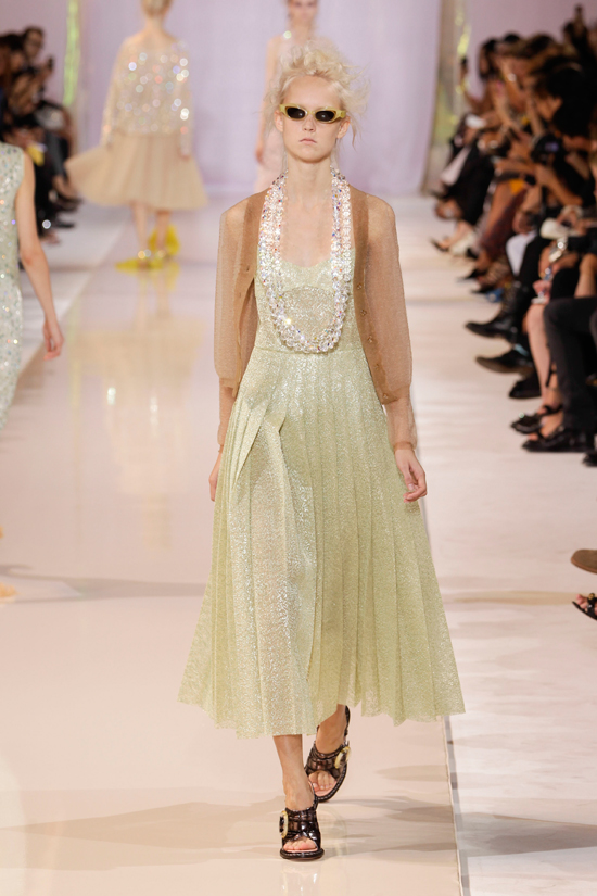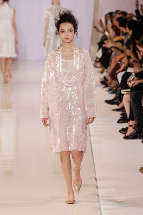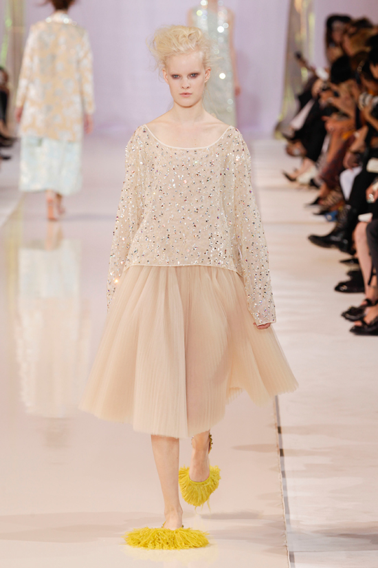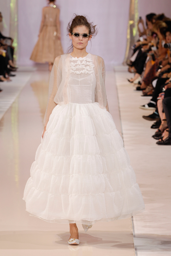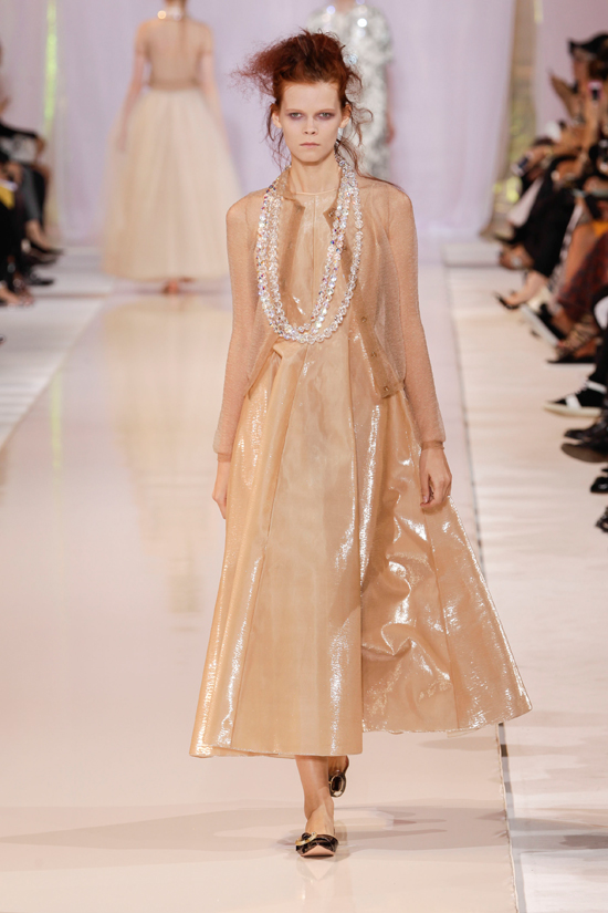 Это была коллекция, целиком и полностью посвященная экспериментам с материалами, где одна фактура накладывалась на другую, а та в свою очередь на третью. Органза, спаянная с шелком и бархатом, кружево, сделанное словно из сахара и готовое сию секунду рассыпаться, переливающийся жаккард с приваренными к нему кристаллами Swarovski и гигантские стеклянные бусы в качестве аксессуара – Занини умеет сказку сделать былью.