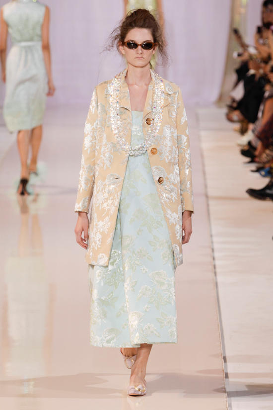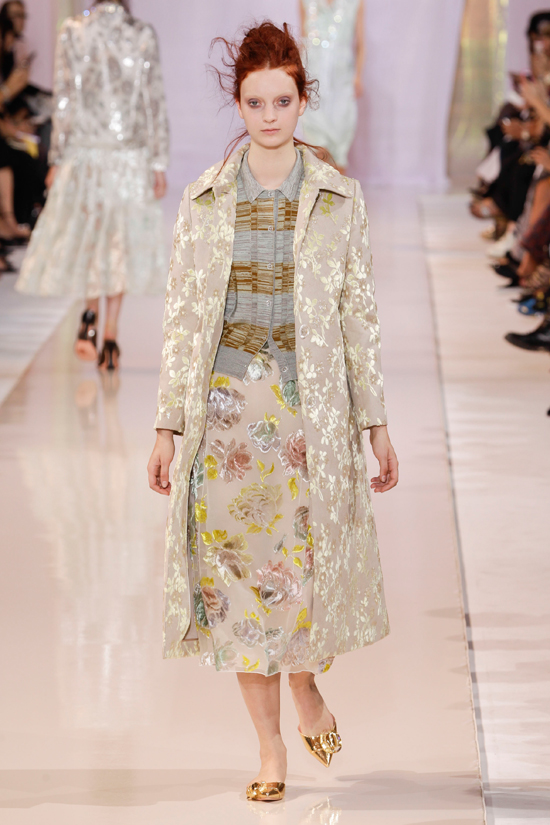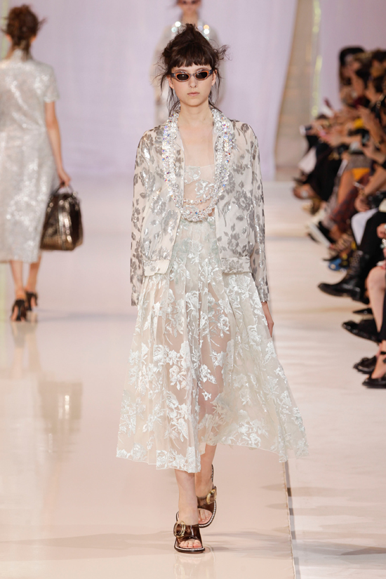 Сами силуэты одежды были максимально простыми и тем самым компенсировали избыточность фактур. Встречались здесь и узкие юбки-карандаши (из пластичной, не жесткой ткани), прямые плащи с отложным воротником, короткие жакеты, легкие воздушные платья и даже пятидесятнический кардиган. Если бы Занини сшил их из обычных материалов, они бы легко сошли за базовый гардероб. Но даже в этом случае они все равно выглядели бы женственно.
