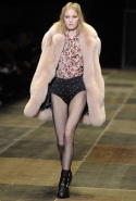 Впрочем, был один лук, заставивший вспомнить об Иве Сен-Лоране — это розовая лисья шуба с черными трусами и блузкой в цветочек. Такая же, только зеленого цвета, надетая на нижнее кружевное белье с шортами, была в знаменитой коллекции "40-е", показанной зимой 1971 года, одной из самых провокационных и самых неоднозначно воспринятых коллекций Сен-Лорана. Черные колготки там тоже, кстати, были. При отсутствии всякого сходства между этими двумя коллекциями — и этими двумя людьми — есть что-то общее в такого рода жестах, в этом стремлении обманывать ожидания.